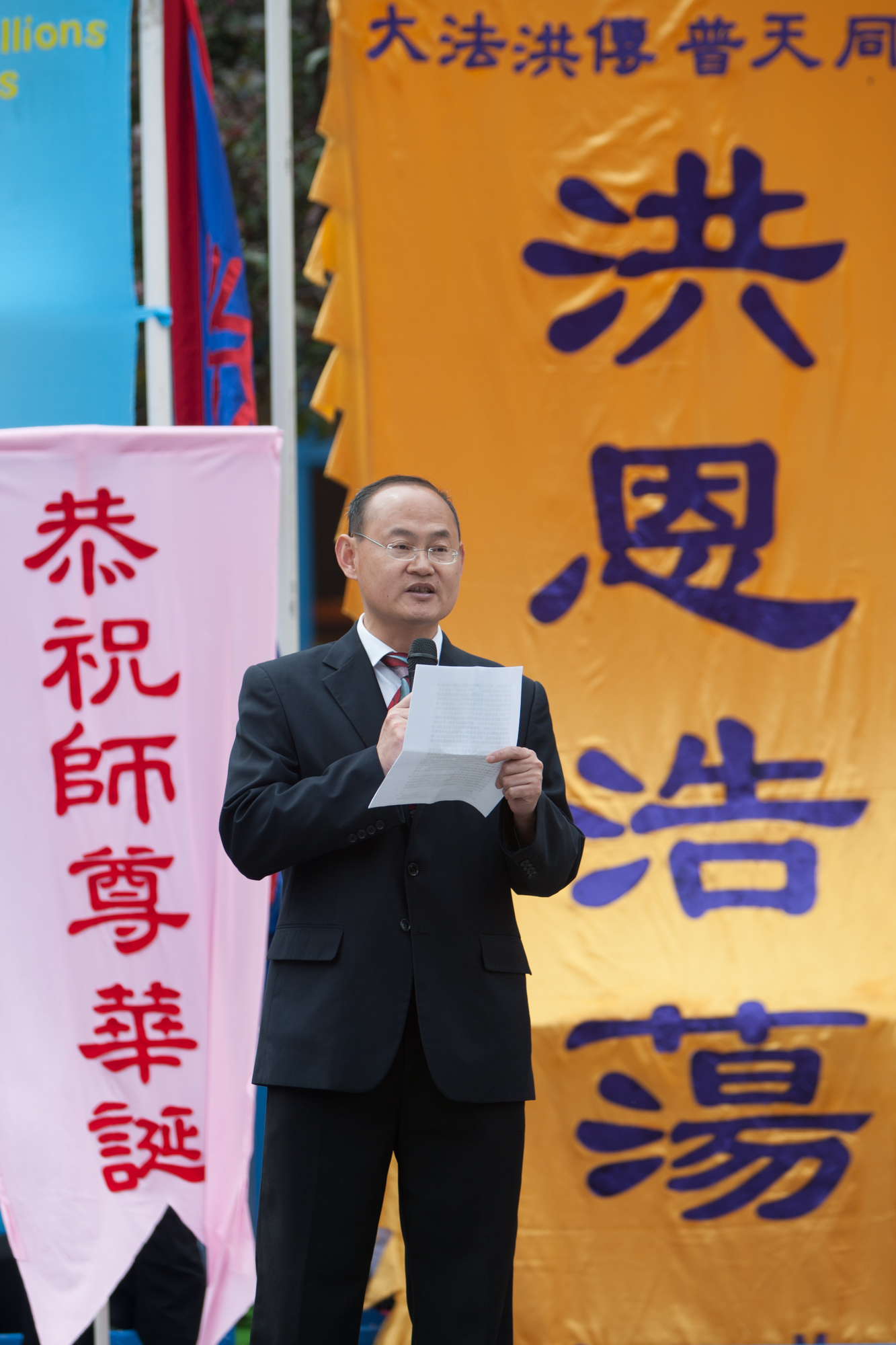 集会主持人高洁表示,今年的五月十三日是法轮大法传世二十三周年的纪念日,同时也是法轮大法创始人李洪志先生的六十四岁华诞。每年的五月十三日,各个国家的法轮功学员,都会以自己的方式庆祝世界法轮大法日。今天,旧金山的法轮功学员和世界各地的法轮功学员一样,向李洪志师父表示我们最崇高的感恩和敬意。同时我们也希望更多的朋友们了解法轮功是什么,象法轮功学员一样,得法、祛病健身,做一个更好的人。