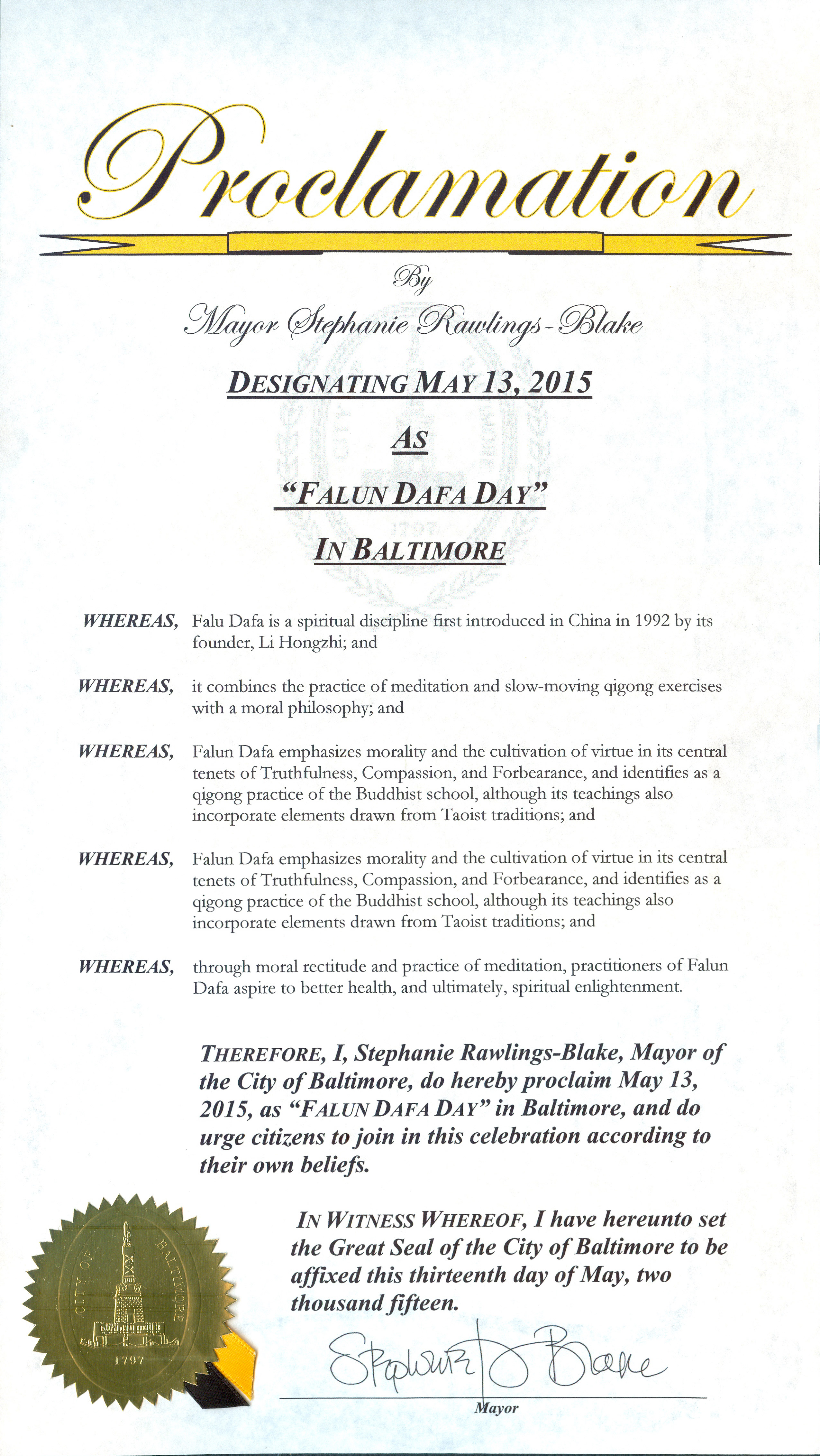 因此,我,斯蒂芬妮•罗林斯•布莱克,巴尔的摩市长,在此宣布二零一五年五月十三日为巴尔的摩“法轮大法日”,并呼吁民众根据自己的信仰加入这一庆典。