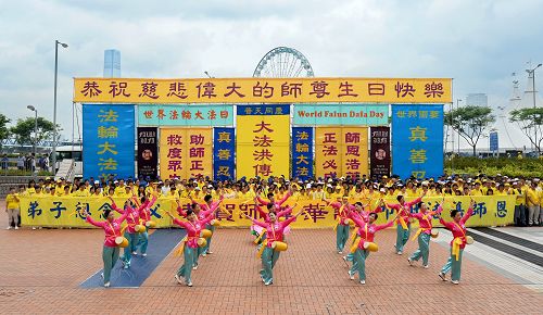 十日上午,数百名法轮功学员齐聚中环爱丁堡广场,在悠扬的音乐声中炼功,展开一天的庆祝活动。随后学员们整齐列队在“恭祝慈悲伟大的师尊生日快乐”的巨型横幅下,观赏腰鼓队带来庆贺的表演,格外喜气洋洋。