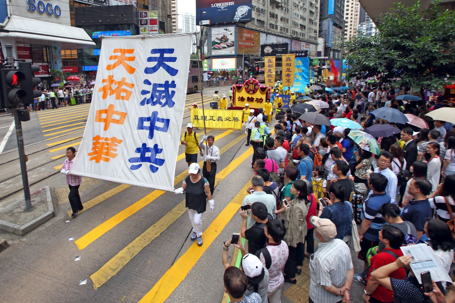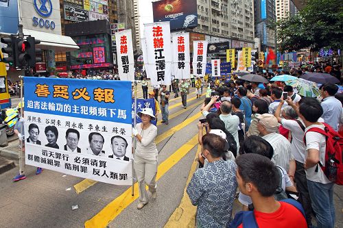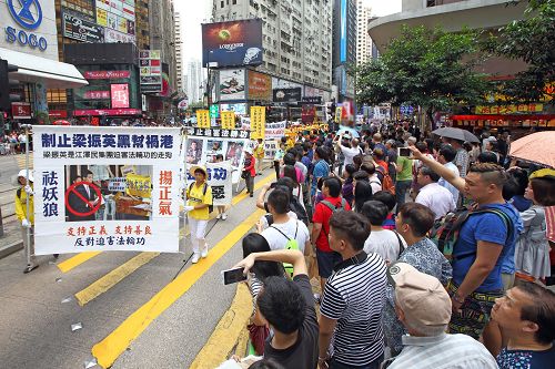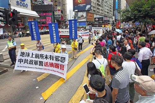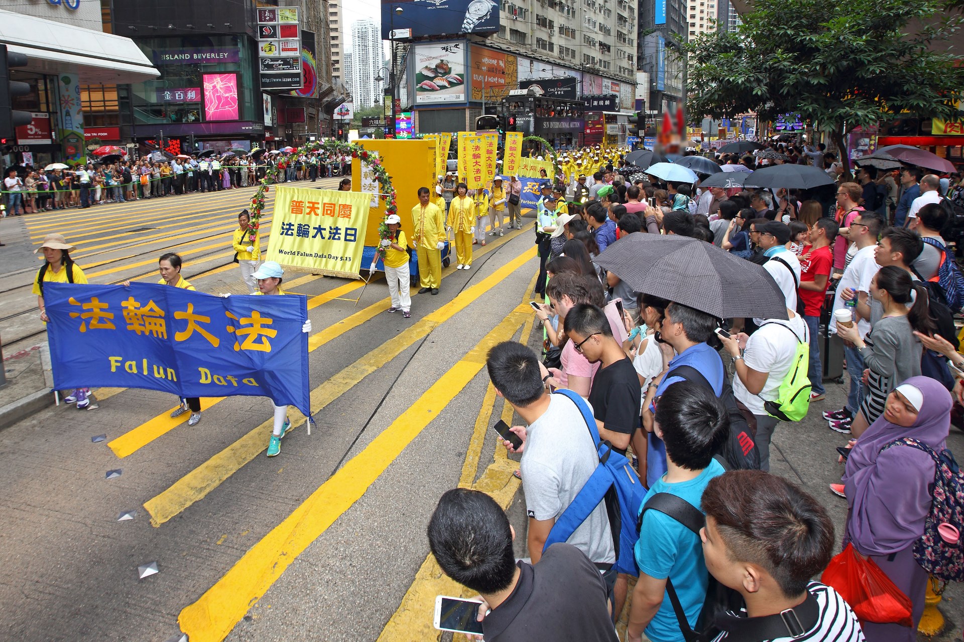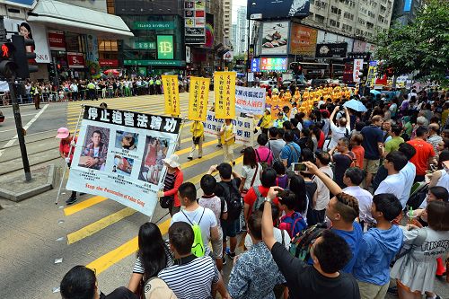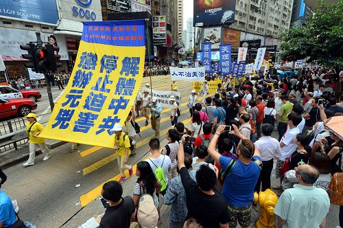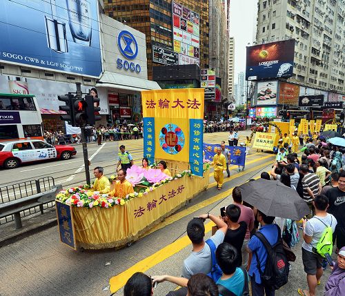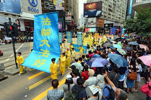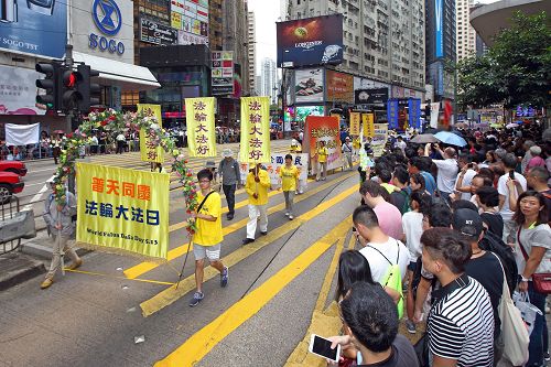在中环爱丁堡广场的庆祝活动于中午前结束。下午二时,游行队伍在天国乐团吹奏“法轮大法好”、“法轮圣王”等多首雄威动人的音乐引领下,从维多利亚公园出发,途经铜锣湾、湾仔、中环等闹市,前往终点:上环中山纪念公园。沿途吸引许多市民和大陆游客驻足观看,纷纷举起手机、相机拍下画面。