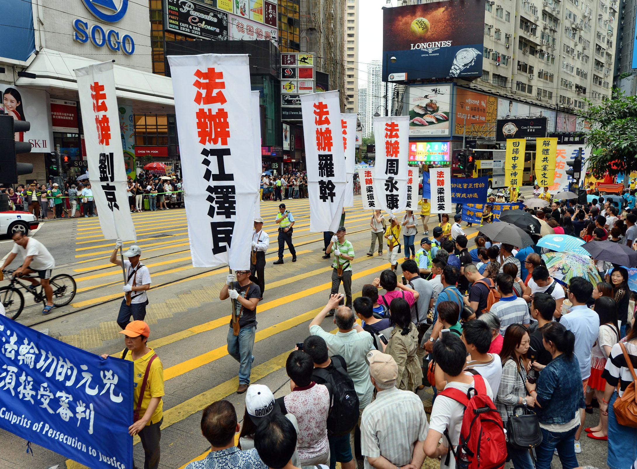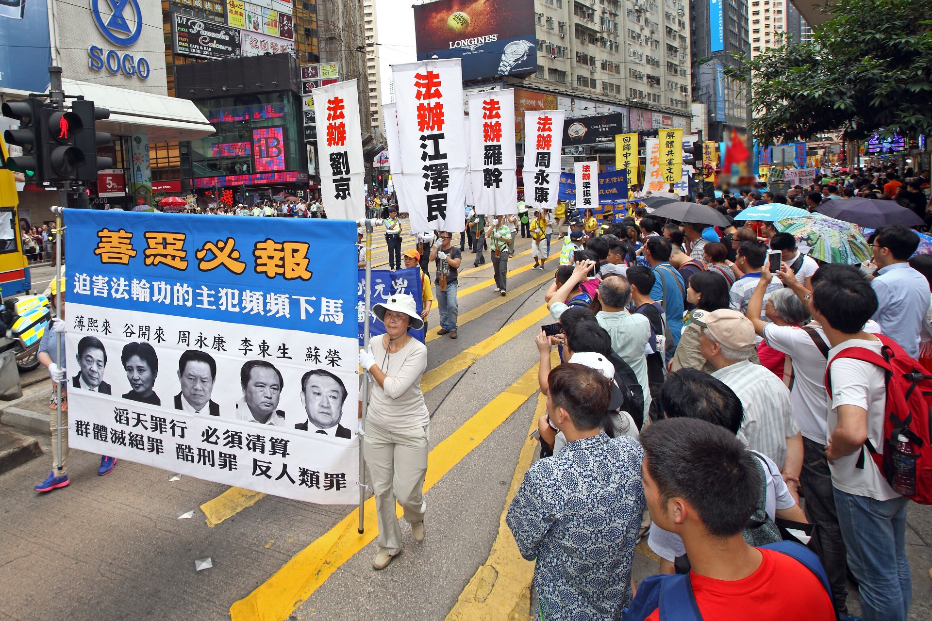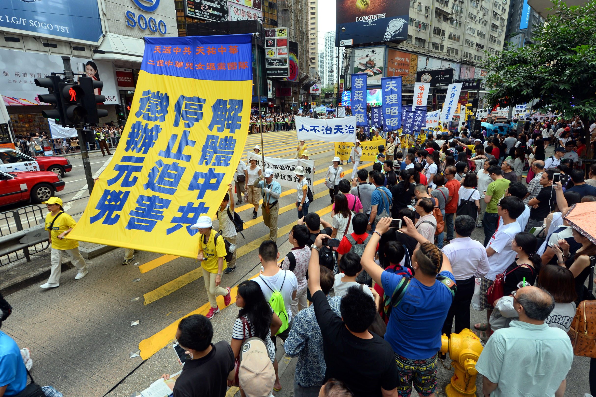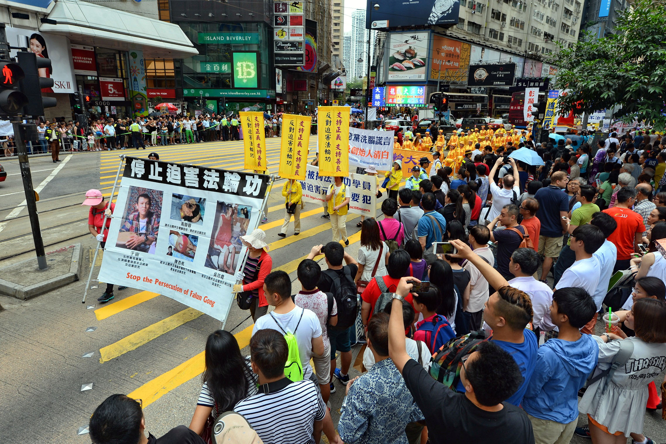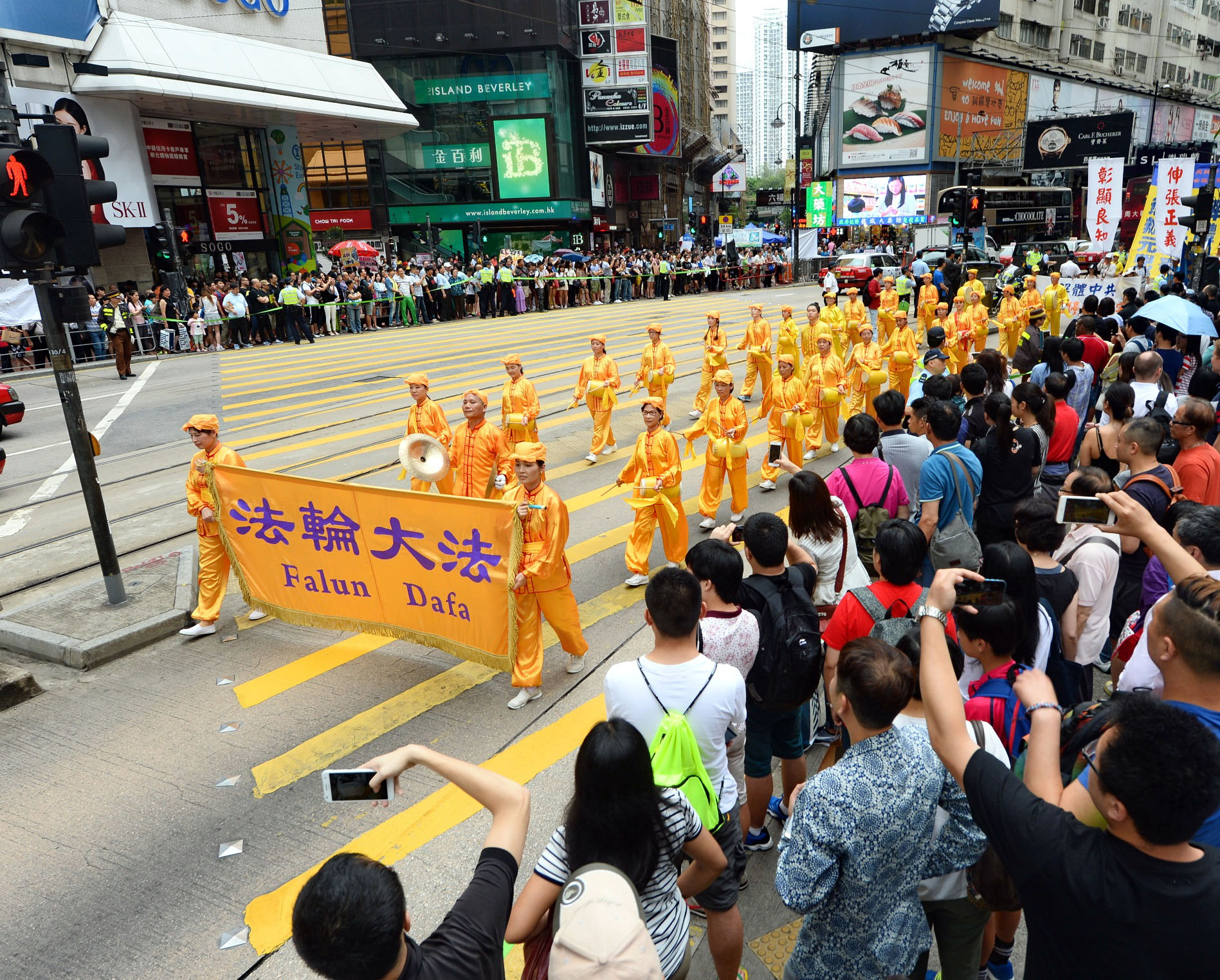 图5-10:法轮功学员的游行队伍在天团乐团引领下,走过港岛区闹市街道,吸引港民及中西游客驻足观看及拍照。