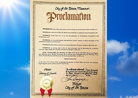 为庆祝第十六届世界法轮大法日,美国密苏里州圣彼得市市长及市议会颁发褒奖,宣布五月十三日为圣彼得市法轮大法日。