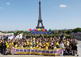法国法轮功学员聚集在巴黎埃菲尔铁塔下的人权广场,庆祝法轮大法日——法轮大法洪传世界二十三周年,感谢师尊救度之恩。