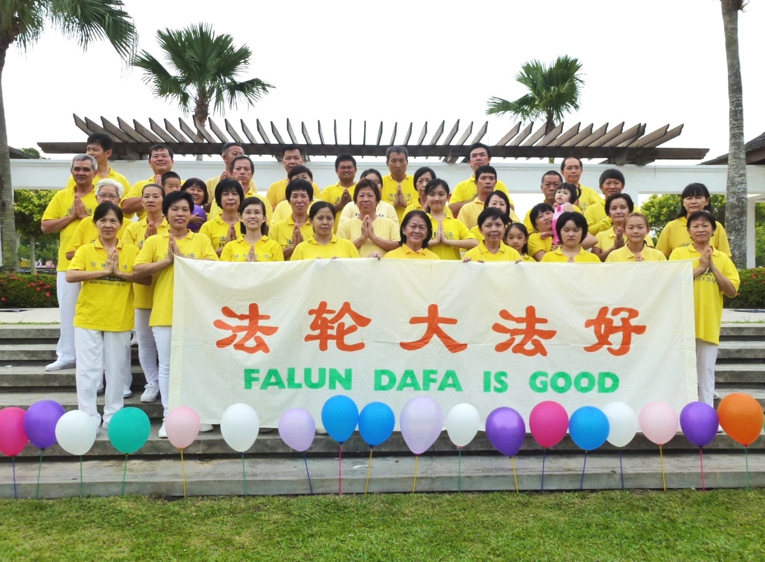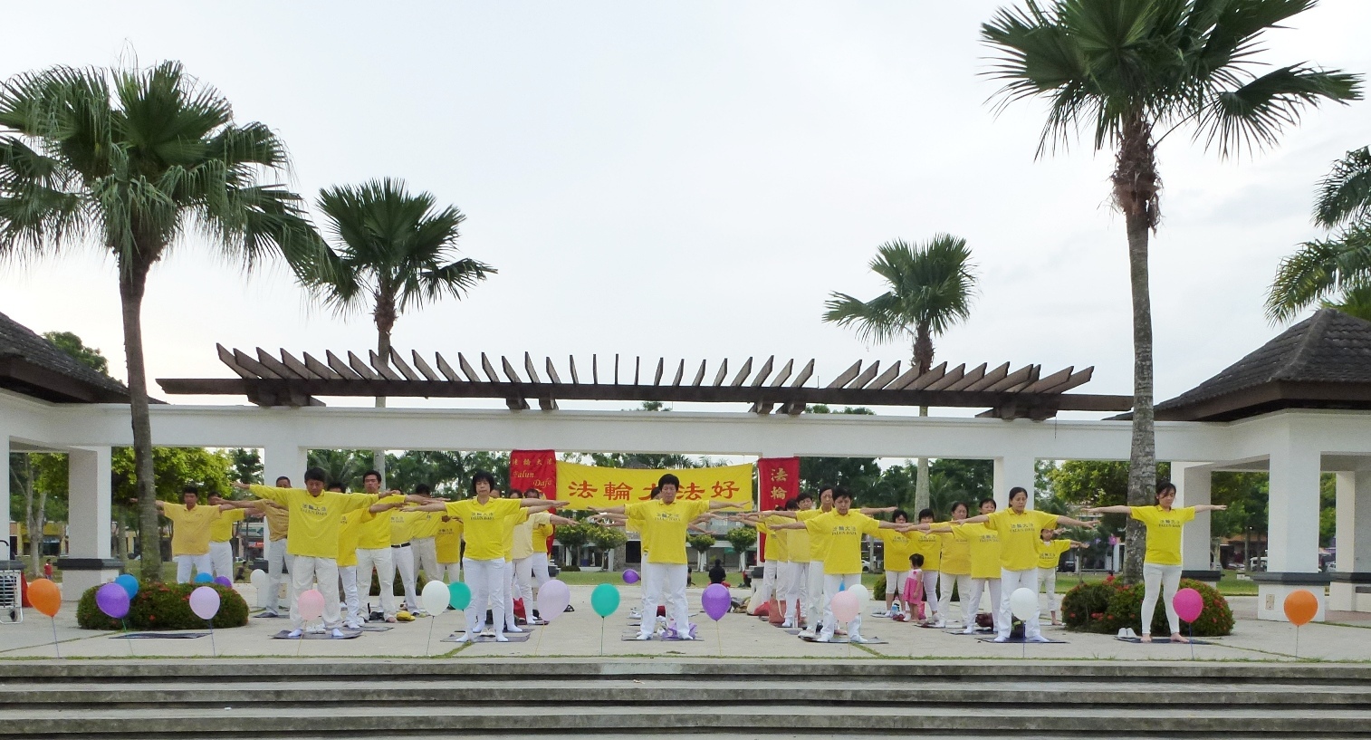 马来西亚槟城和双溪大年法轮功学员在槟城植物园炼功点恭祝师尊生日快乐!