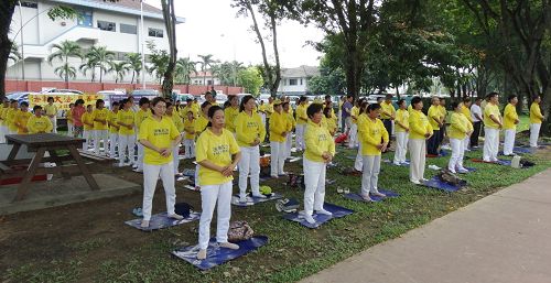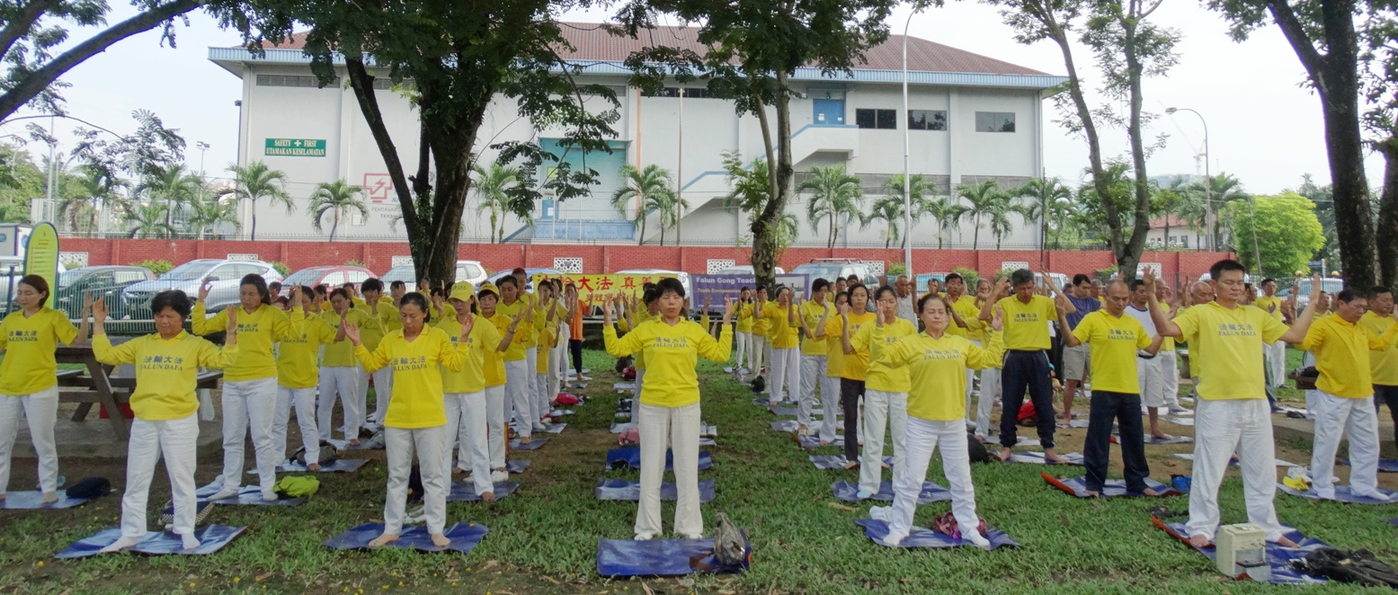 马来西亚柔佛州新山法轮功学员举行集体炼功,迎接法轮大法弘传世界二十三周年。
