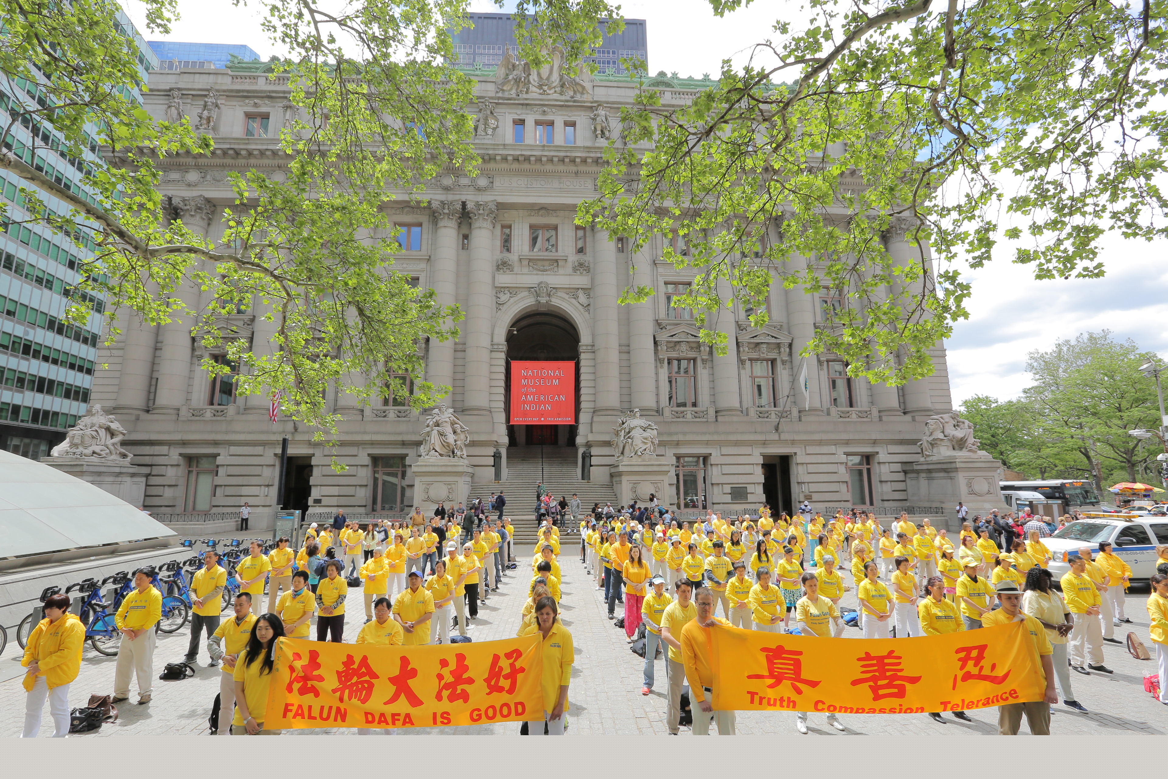 宝林绿公园 (Bowling Green Park)是纽约最早的市区公园,五月十三日早晨,部份从世界各地前来纽约参加“庆祝第十六届世界法轮大法日”系列活动的法轮功学员在公园集体炼功,吸引了很多路人学功。