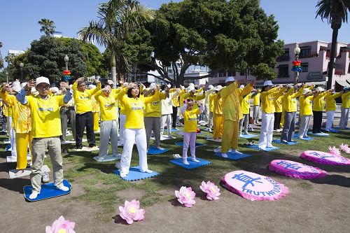 圣莫尼卡码头是洛杉矶的著名景点,每年吸引成千上万来自世界各地的游客。法轮功学员的庆祝活动以集体炼功开始,吸引了不少游人驻足。有的过路者也模仿炼功动作,或在草坪上静静炼功的人群“合影”留念,有的则阅读传单详细了解法轮功。