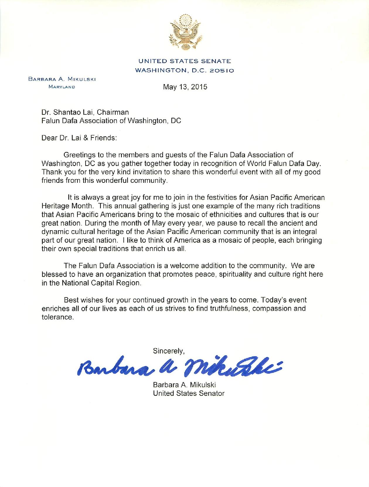 ![]() 美国参议员芭芭拉·米库斯基的贺信 |