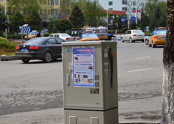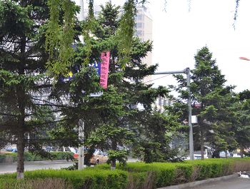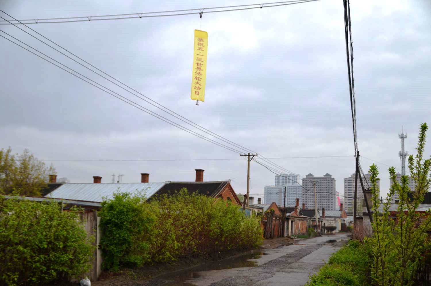 【明慧网二零一五年五月十六日】春雨洗礼过的大陆东北某地,树木刚刚披上新绿,城镇乡村多处可见“法轮大法好”的条幅、标语、海报和黏贴,庆祝五一三世界法轮大法日。