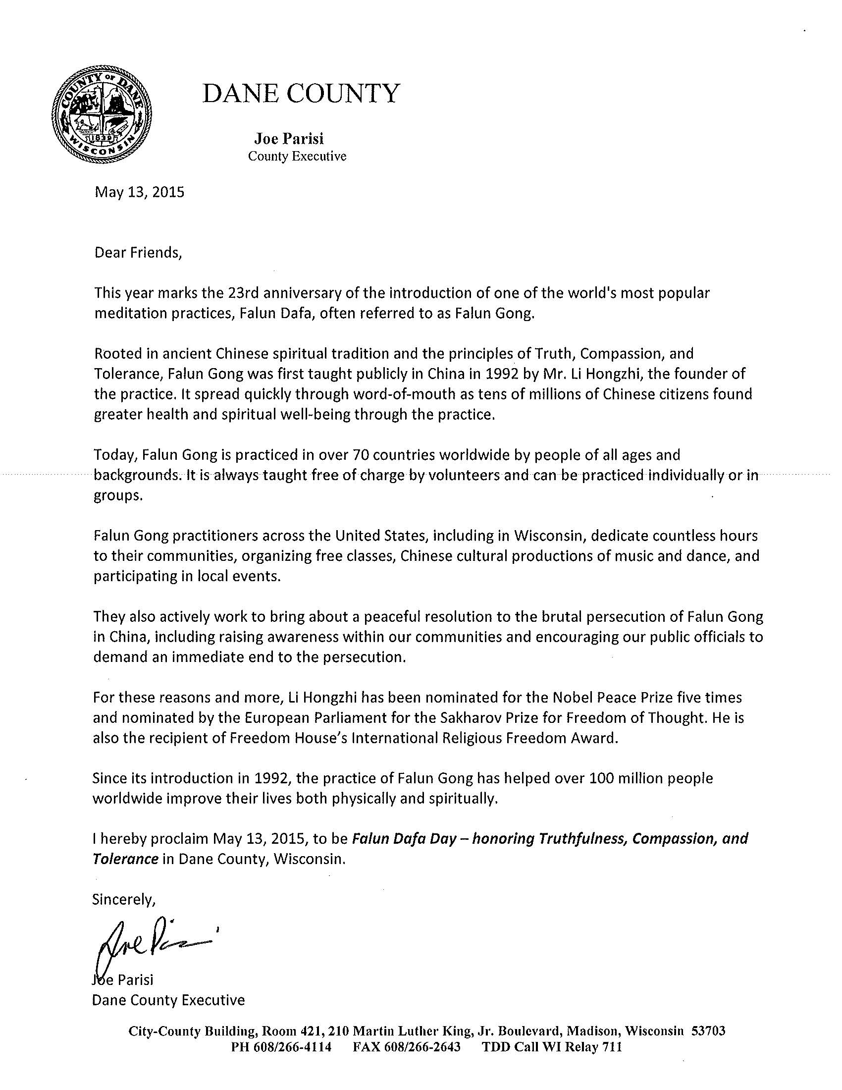 【明慧网二零一五年五月十六日】二零一五年五月十三日,美国威斯康辛州戴恩县行政长官Joe Parisi (乔•帕里西)颁发褒奖信函,宣布“五月十三日为法轮大法日”。
