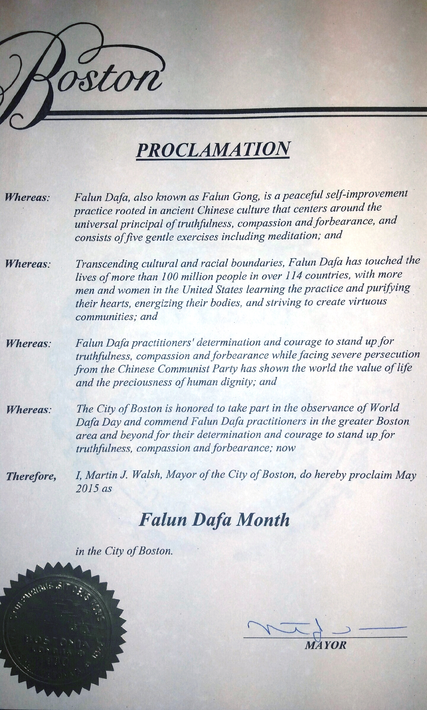 因此,我,马丁•沃尔什,波士顿市市长宣布二零一五年五月为波士顿市法轮大法月。