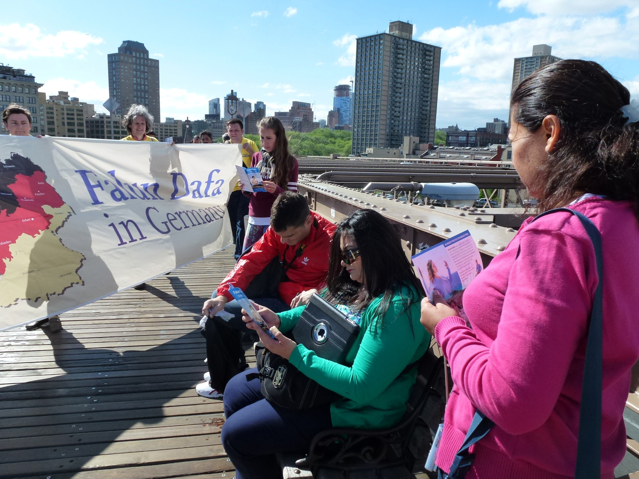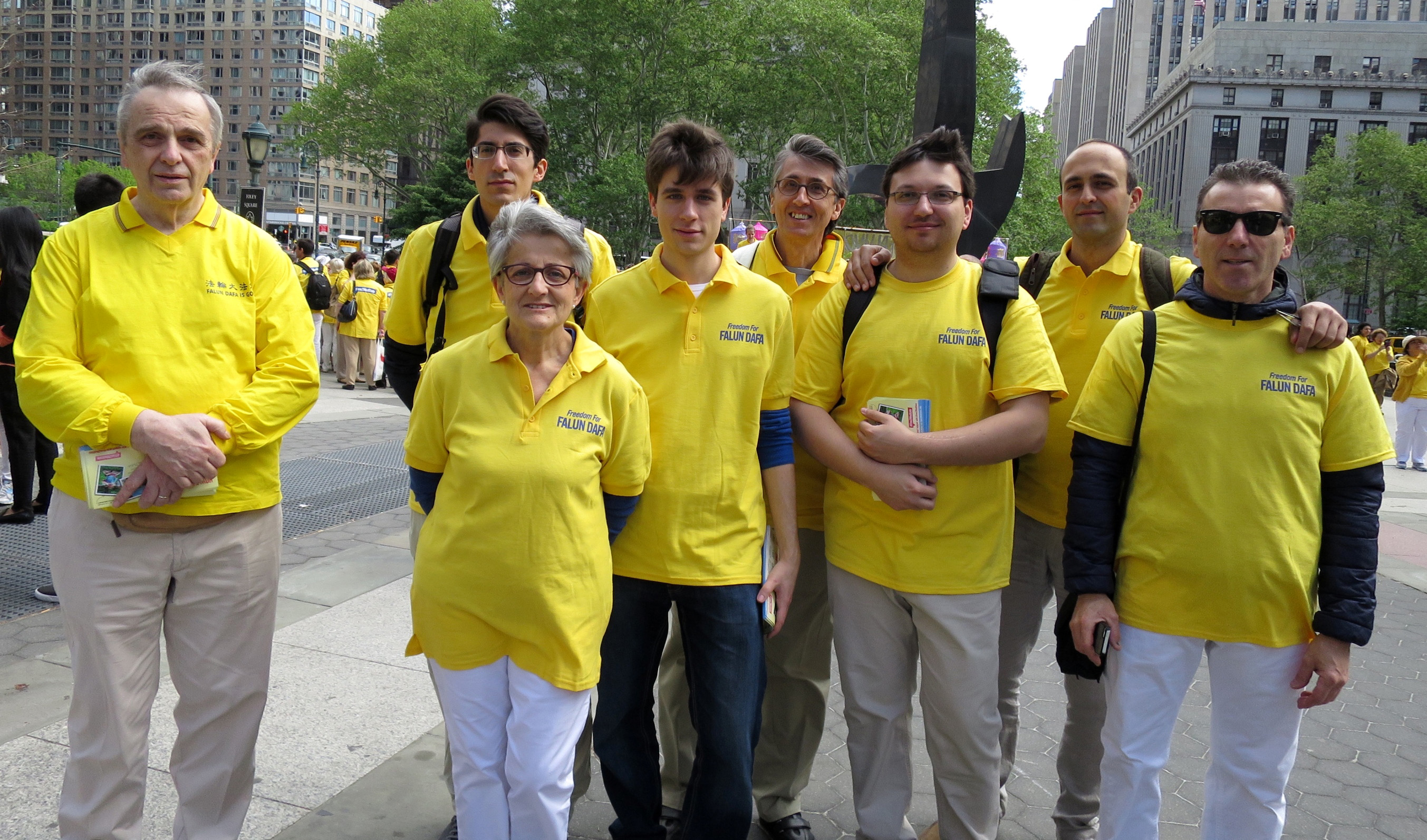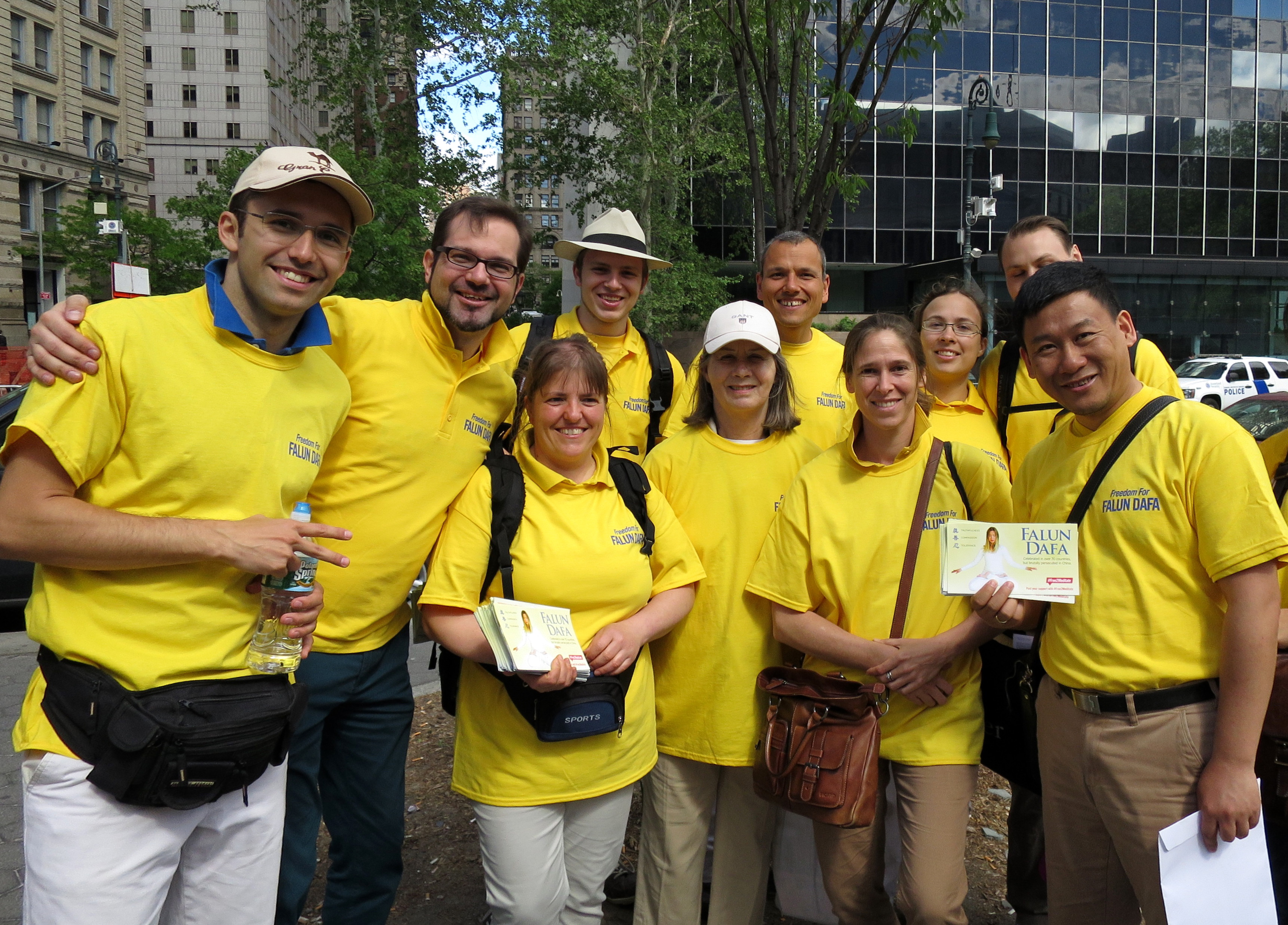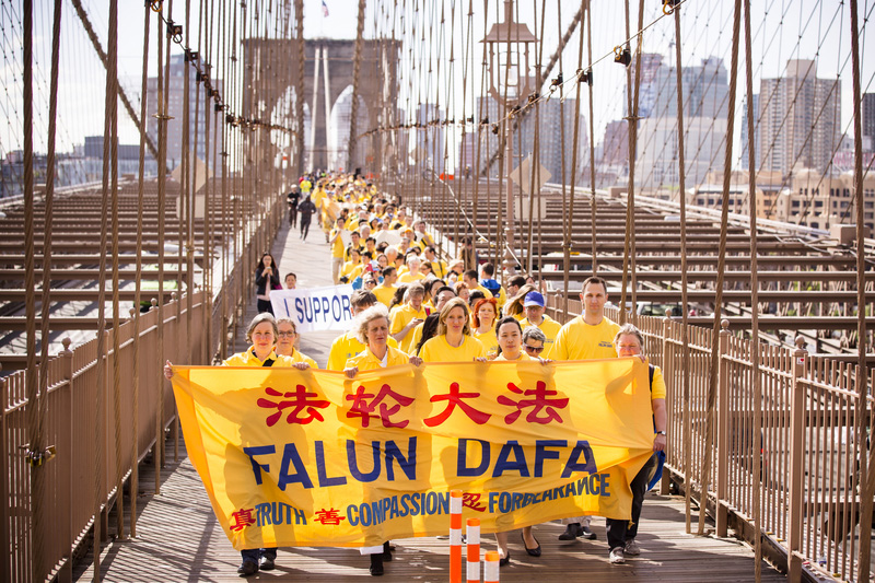 五月十二日至十五日,八千多名来自世界各地的法轮大法学员陆续来到纽约,以丰富多彩的各种活动庆祝法轮功洪传二十三周年和第十六届世界法轮大法日。来自欧洲和中东地区的法轮功学员以步行跨越纽约东河上的布鲁克林大桥的方式向民众介绍法轮功,庆祝节日。尽管说着不同的语言,有着不同的肤色,但他们有着一个共同的愿望:与世人分享法轮大法的美好,让人们知道法轮功学员在中国遭受迫害的真实情况。