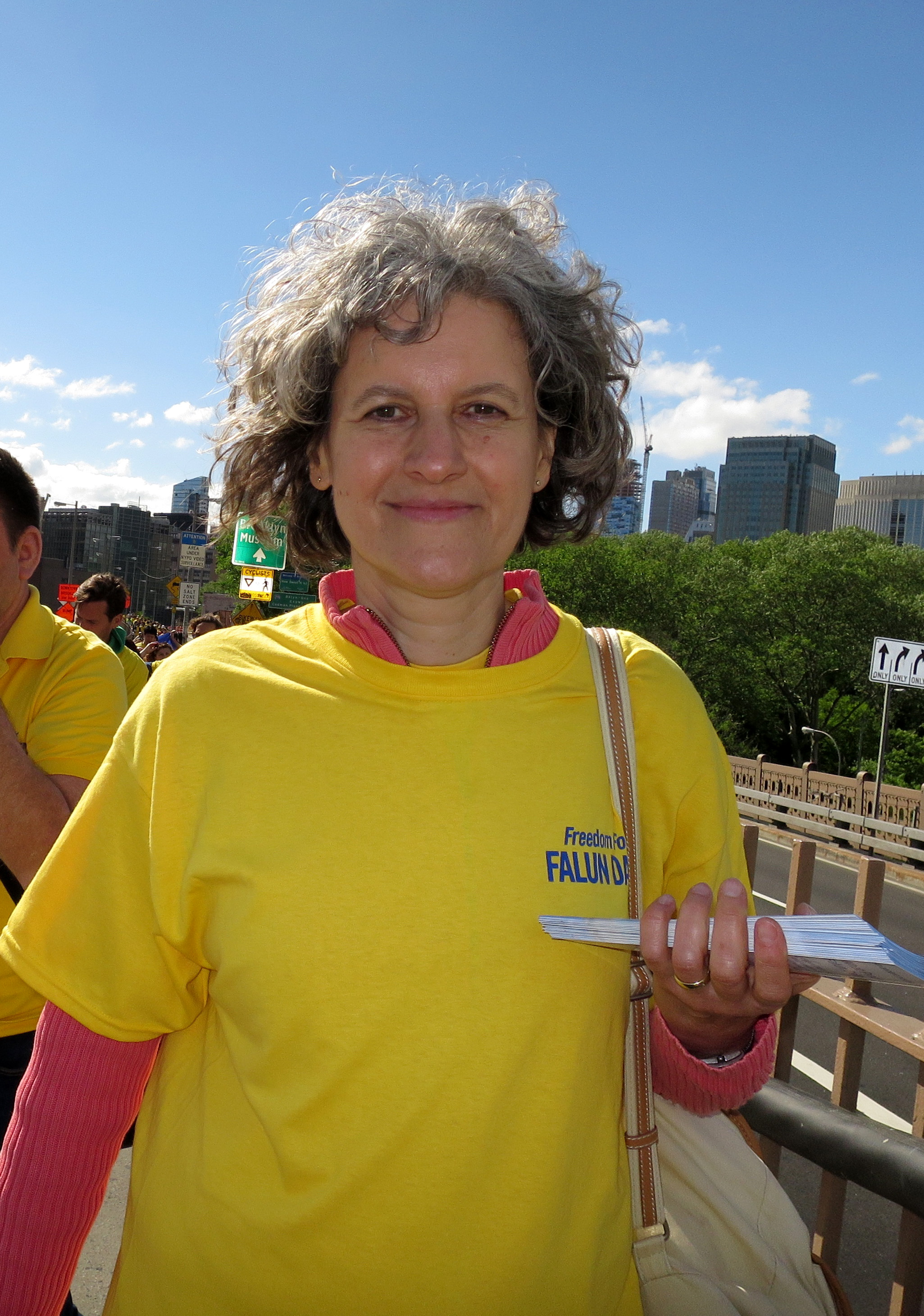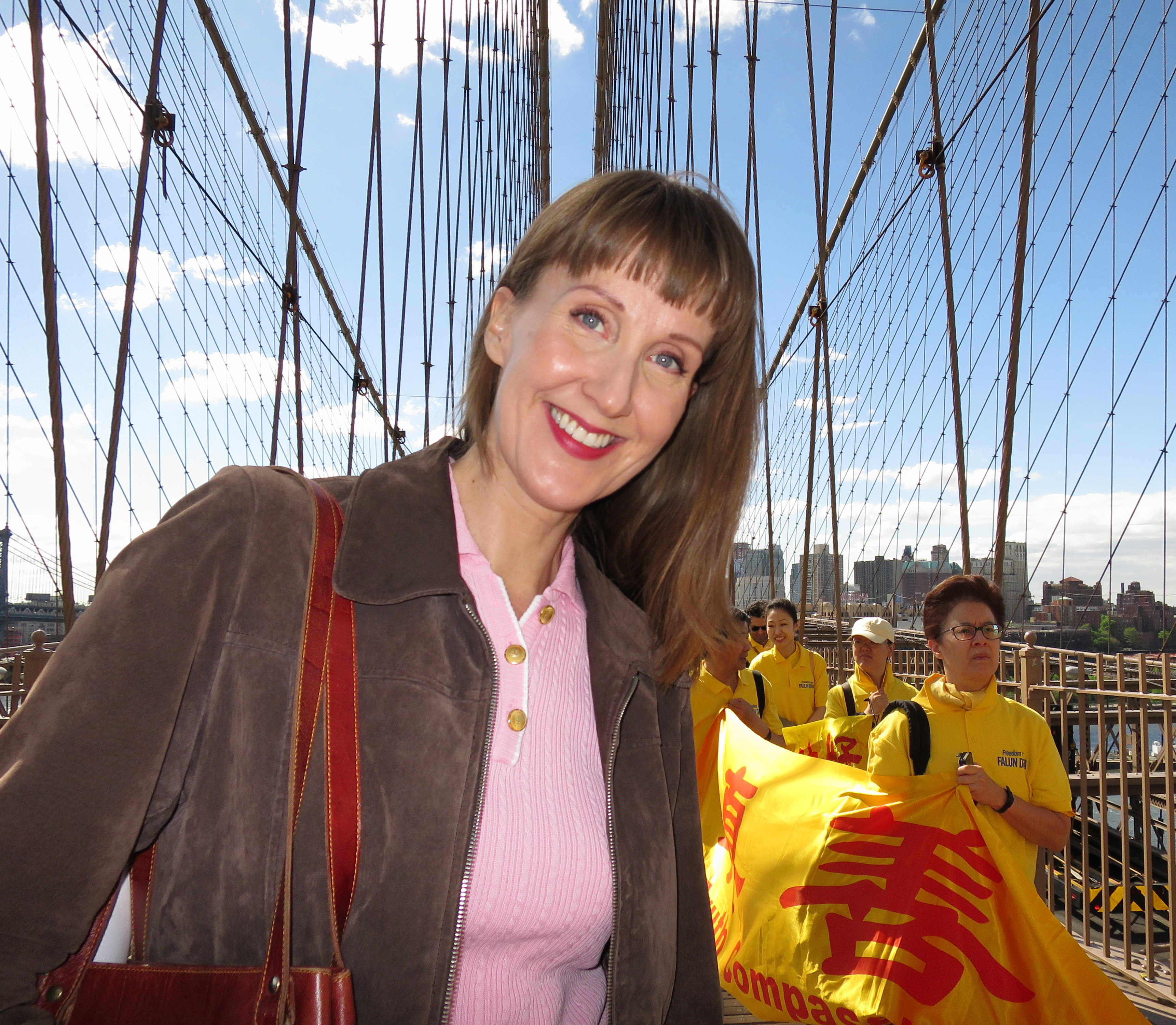 茜妮•库纳斯(Sini Kunnas)女士在布鲁克林大桥上看到法轮功学员长长的步行队伍很兴奋。她对中国情有独钟,她去过很多次中国,也有很多中国朋友,用她的话说:“我爱中国人,我喜欢中国人。”她非常喜欢这个跨桥活动,特别是这个以善的方式来反对迫害的活动。