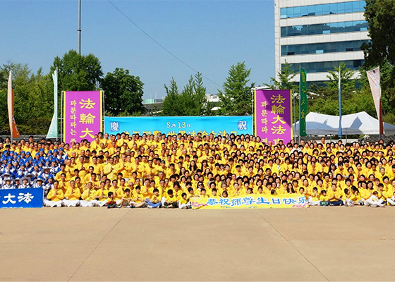 - 韩国庆祝世界法轮大法日 弟子拜谢师恩(图)- 来自韩国各地的八百多名法轮功学员在韩国首尔光化门“开放市民广场”集会庆祝法轮大法日,并恭祝李洪志师父六十四岁华诞。