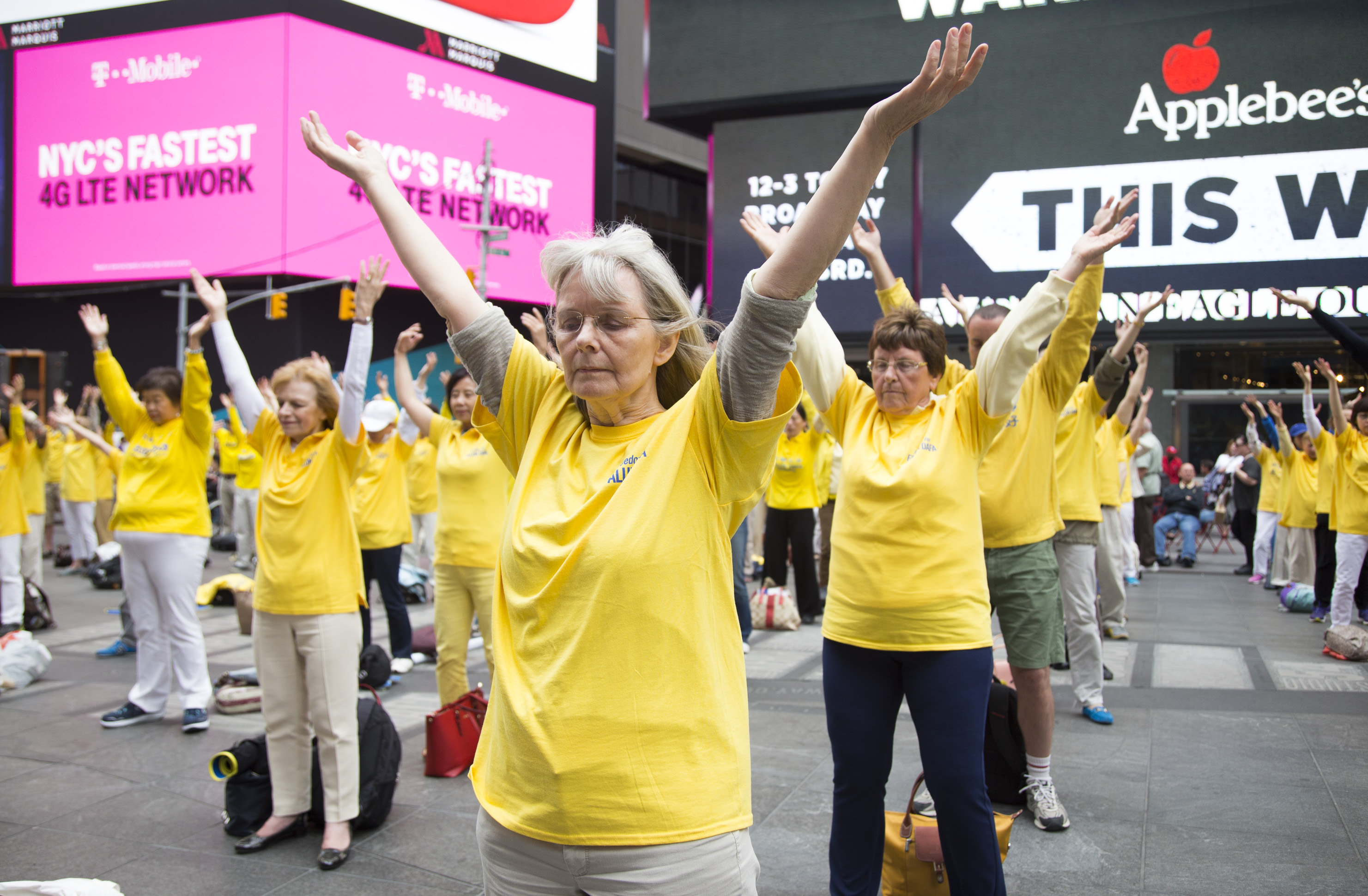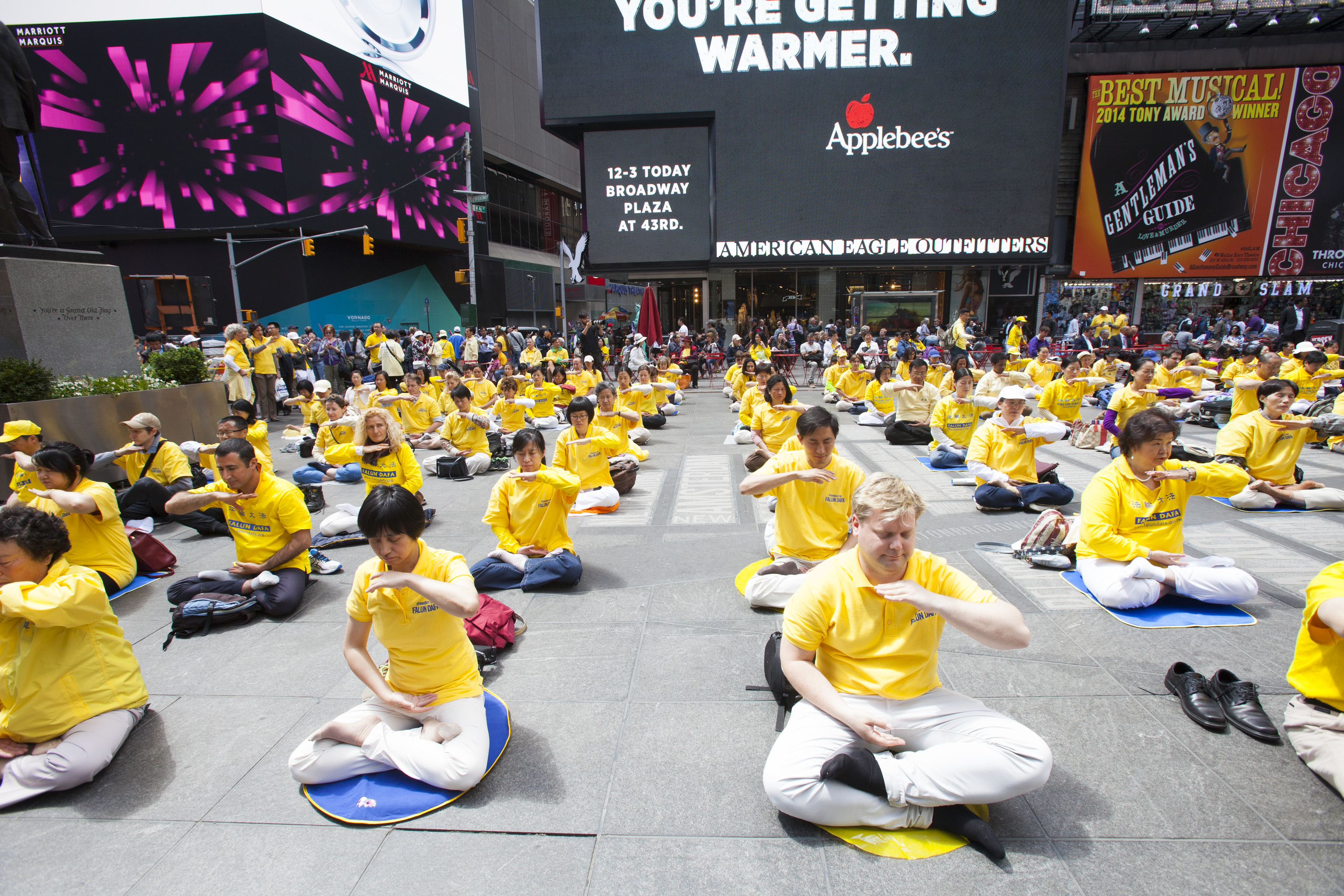 这群打坐的人有着不同的肤色,说着不同的语言,他们是从世界各地来到纽约的八千多位法轮大法修炼者中的一部分。他们在纽约以丰富多彩的方式来庆祝法轮大法洪传二十三周年,暨第十六届世界法轮大法日,五月十三日和十五日分别在时代广场上进行的功法演示是活动之一。