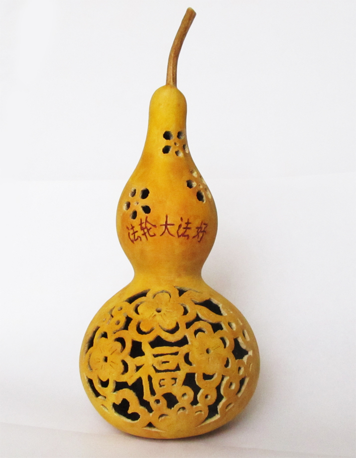 说明:梅花、福字是镂空雕刻的。“法轮大法好”是刻上的,刻上后,再用笔描了一下。