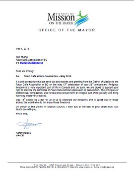 二零一五年五月一日,不列颠哥伦比亚省密新地区(District of Mission)市长Randy Hawes致信法轮大法协会,对法轮大法弘传二十三周年表示“美好的祝愿和问候”,并称“我们的心与你们在一起”。