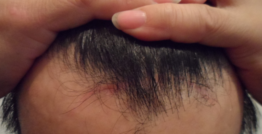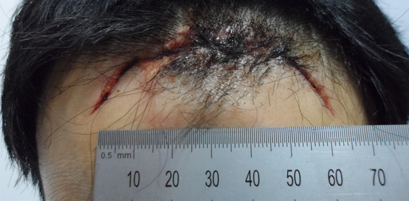 事情发生后,我一直想将此次经历写出来,见证法轮大法的美好与无边法力。2015年4月3日,我又找同修帮助拍下了额头伤口的照片(图二),这时才发现,伤口创面完全愈合,除了很浅的一点深色的痕迹外,没有留下任何疤痕。