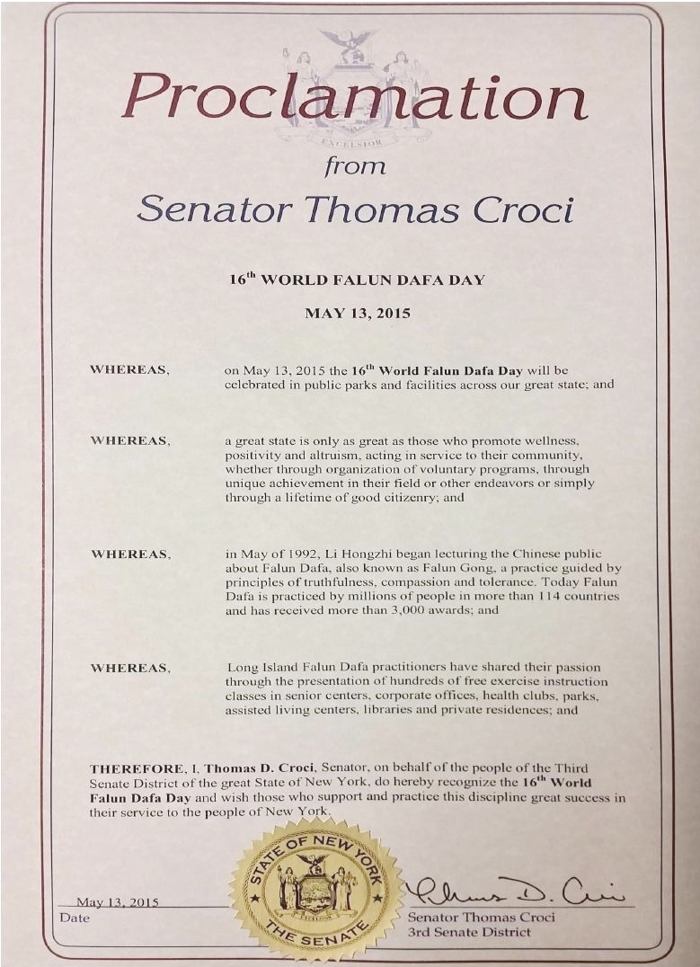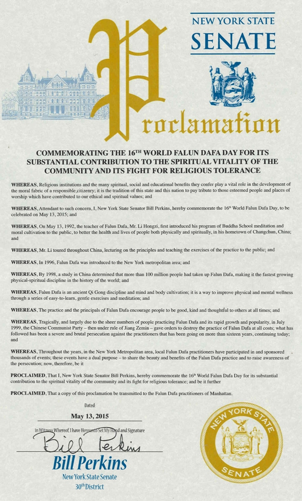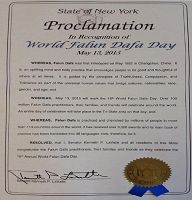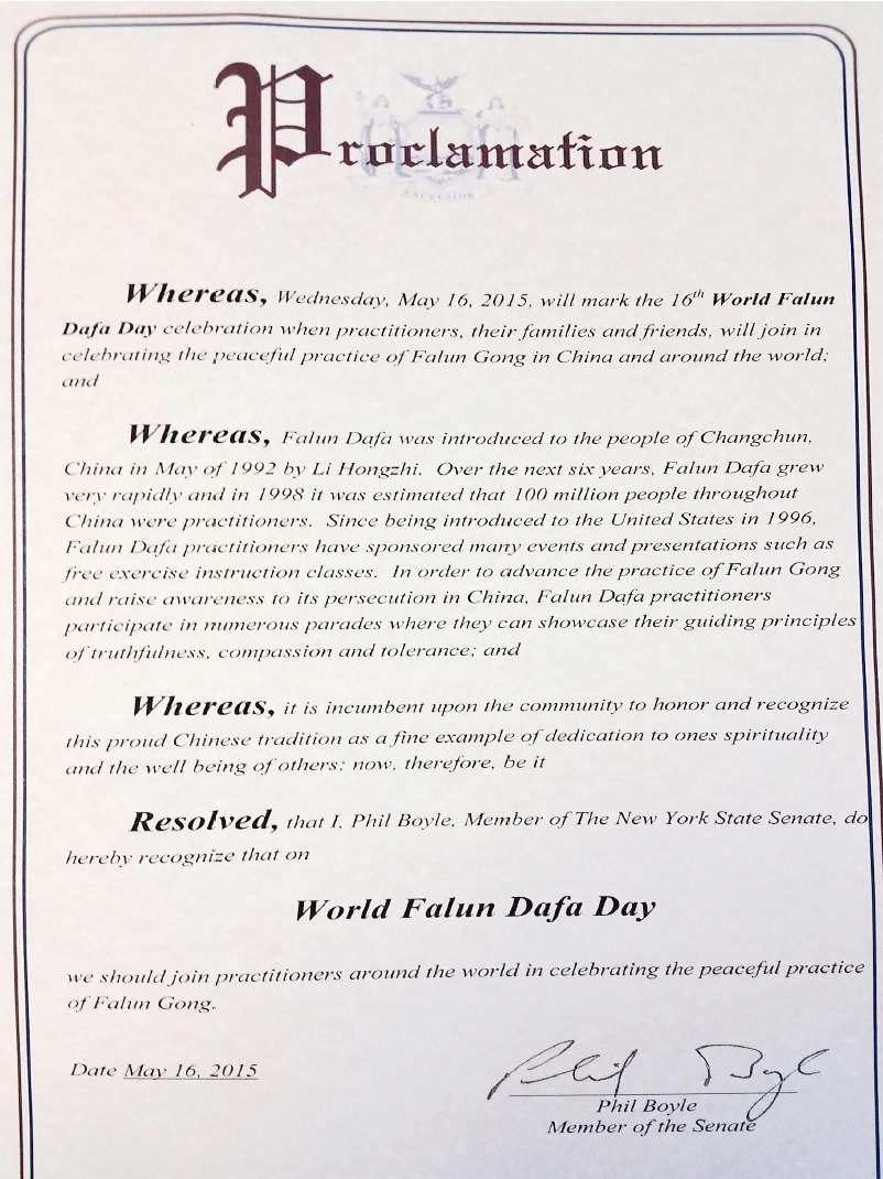 【明慧网二零一五年五月二十日】美国纽约州六名参议员在法轮大法洪传二十三周年,第十六届法轮大法日之际,发来褒奖,祝贺法轮大法日,称颂法轮大法“真、善、忍”的原则,赞扬修炼功法帮助了上亿的人改善身体健康。
