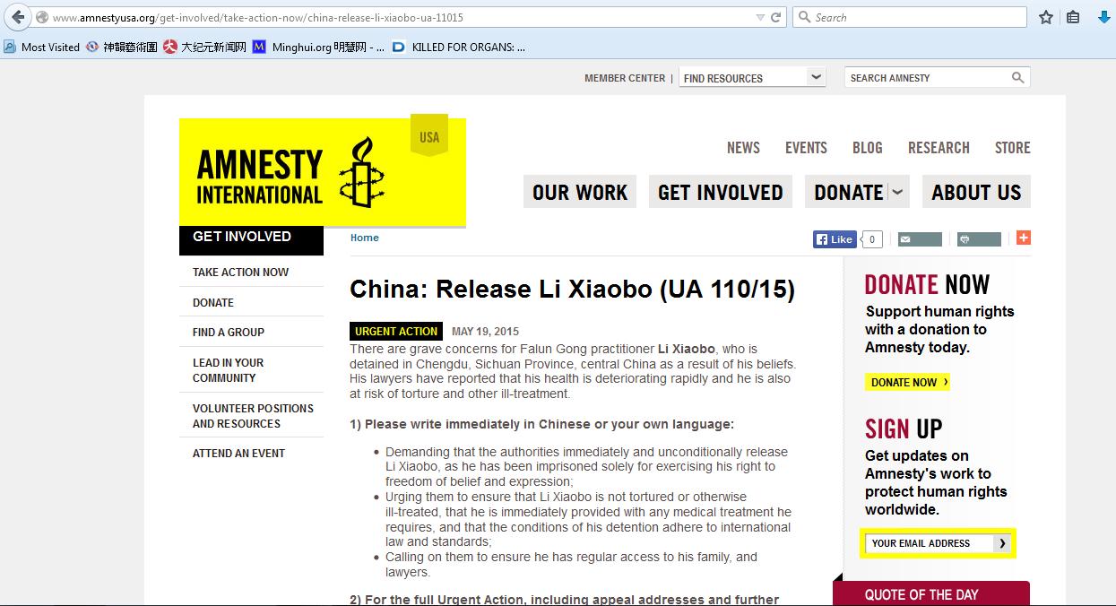 ![]() 图:二零一五年五月十九日大赦国际组织网站截图——紧急行动倡议书:释放李晓波 |