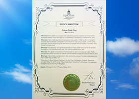 加拿大安大略省金斯敦市宣布二零一五年五月十三日为“法轮大法日”,颂扬“真善忍”的原则。