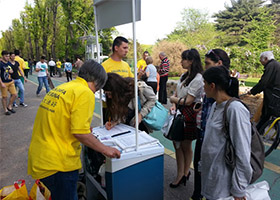 五月十日,一个明媚的周日,来自罗马尼亚全国各地的法轮功学员来到首都布加勒斯特开展庆祝“五•一三”法轮大法日讲真相活动。
