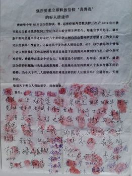 唐建华,女,55岁,贵州新华印刷厂退休工人。2014年9月8日中午向路人散发《九评共产党》书籍时,被正在巡逻的贵阳市云岩区黔灵东路派出所民警绑架到黔灵东路派出所,现非法关押在贵阳市云岩区看守所。2010年唐建华女士曾经被迫害非法劳教一年半。2015年4月3日贵阳市云岩区法院对唐建华非法判处有期徒刑四年(从2014年9月16日起至2018年9月7日止)。现家属已请律师介入,向贵阳市中级人民法院提出上诉。请看到消息的贵州同修及海内外同修和善良人士共同营救唐建华女士,无条件释放法轮功学员。