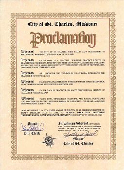 鉴于,圣查尔斯市和法轮大法修炼者于二零一五年五月十三日共同庆祝世界法轮大法日;并且