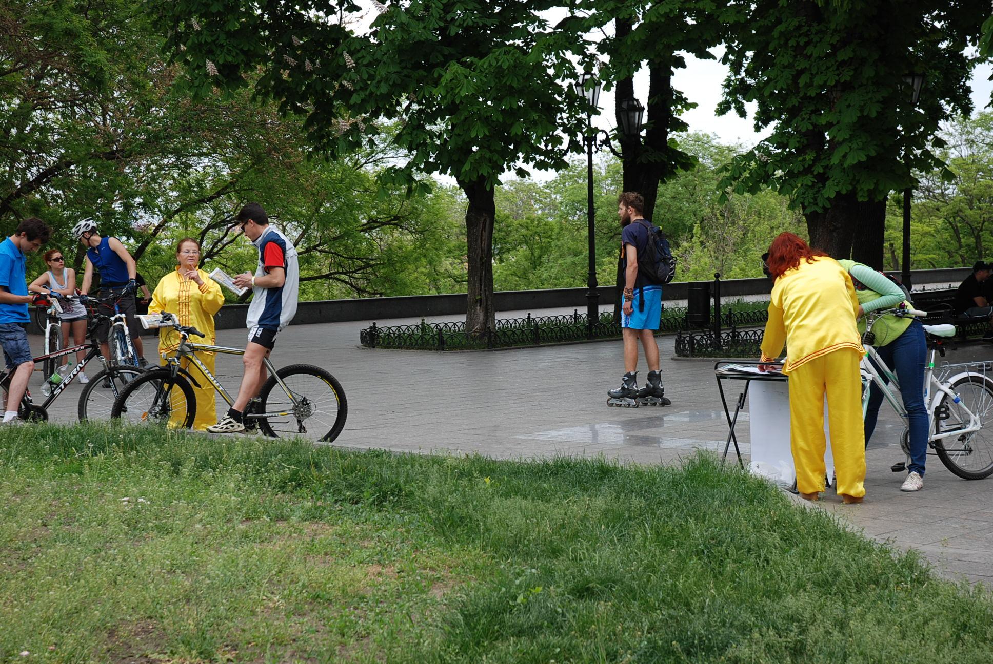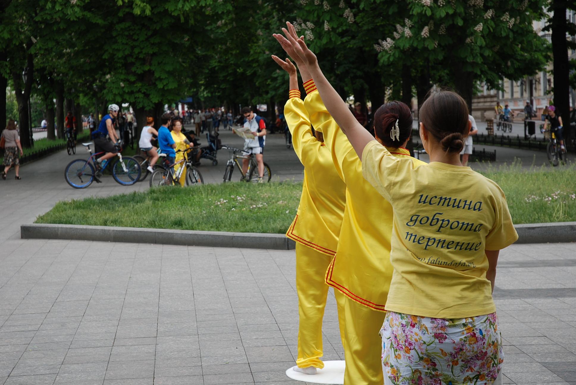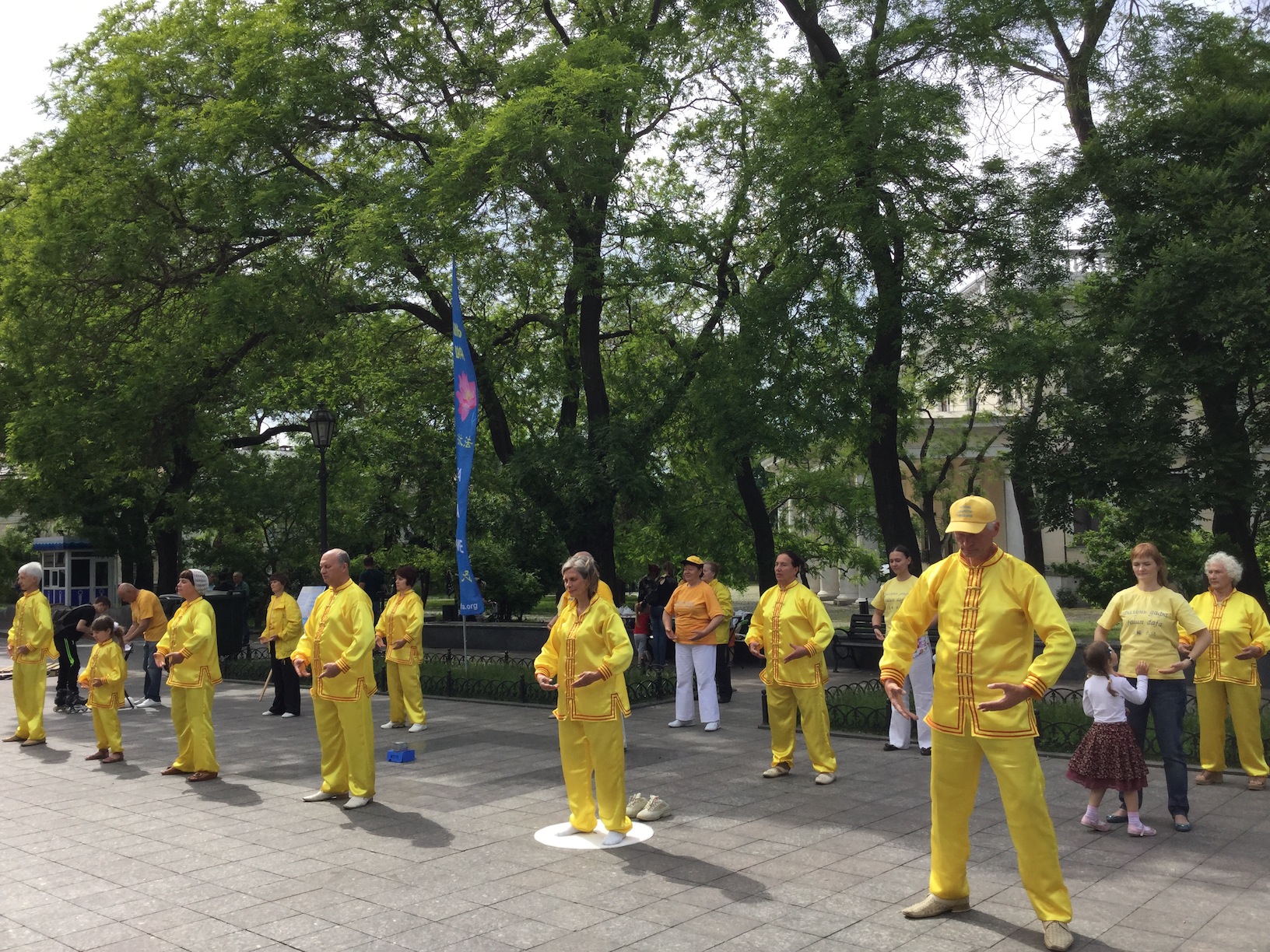 在奥德萨市中心的街心公园,法轮功学员伴随着优美祥和的炼功音乐,向当地市民进行功法演示。世人纷纷驻足观看,并向学员了解法轮功是什么。当世人得知中共发生着令人惊悚的活摘器官的暴行,纷纷签名声援法轮功,对中共的罪恶进行谴责。