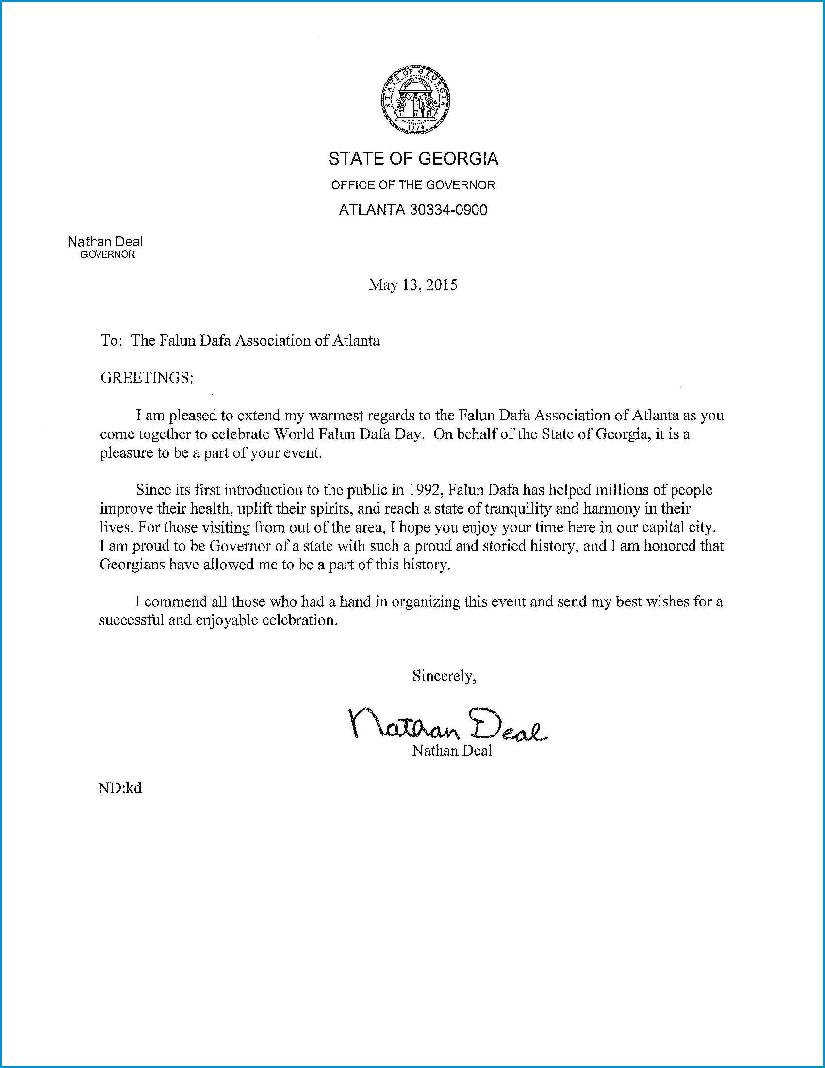 乔治亚州州长内森迪尔(Nathan Deal)在致亚特兰大法轮大法佛学会的信中热情洋溢的说,“当你们聚集在一起、庆祝世界法轮大法日的时刻,我非常高兴的向亚特兰大法轮大法佛学会致以我最热诚的敬意。”