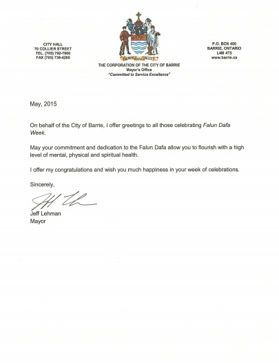 安省北部城市Barrie市长Jeff Lehman在贺信中写道:“谨代表Barrie市,我要向所有庆祝法轮大法周的人们表示祝贺。”