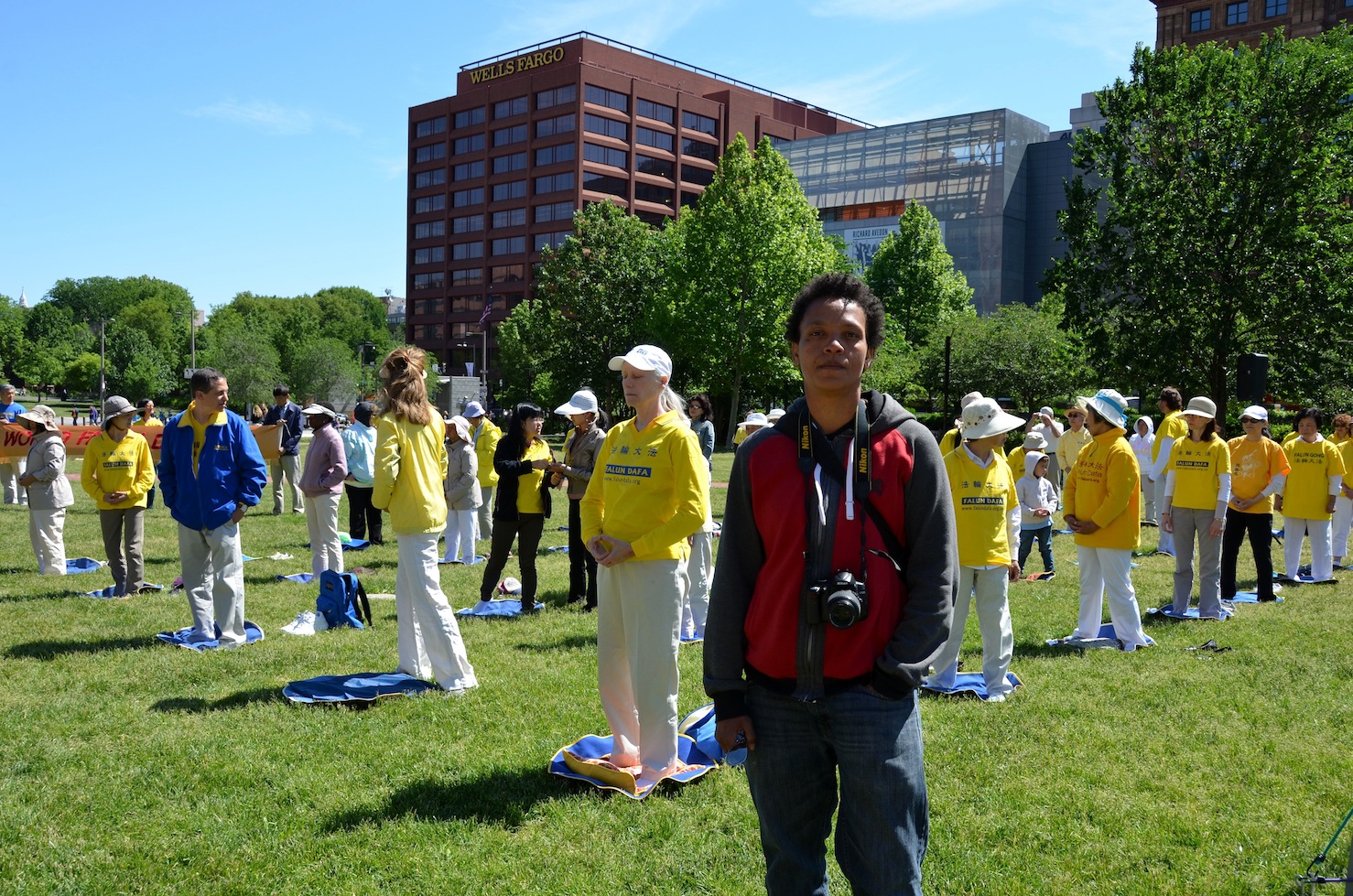 当天,来自美国首都华盛顿的杰里德(Jered)先生参观自由钟时被法轮功学员们盛大的活动场面所吸引。他主动索要法轮功真相资料后,以流利的中文告诉学员说,他在大学时学的专业是国际关系,现在华盛顿的一家联邦政府机构工作,以前曾在台湾学习了两年中文,对中国文化很感兴趣,自己还有一个中文名字叫“柯博文”。他还说,在大学的课堂上曾经接触过法轮功的内容,知道中共对法轮功的残酷迫害。今天看到这么多的法轮功学员平静祥和地展示功法,很感慨。他说支持法轮功学员的反迫害,中共对信仰自由的践踏是不能接受的。