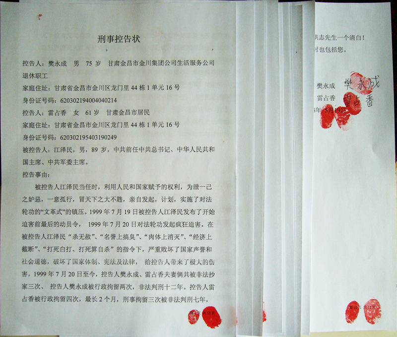 樊永成、雷占香夫妇申请最高人民检察院对江泽民提起公诉,依据国际法追究江泽民反人类罪、群体灭绝罪、酷刑罪的刑事责任;依据《宪法》、《刑法》的规定追究江泽民绑架罪、非法剥夺公民宗教信仰罪、非法拘禁罪、诽谤罪、非法侵入公民住宅罪、敲诈勒索罪、非法搜查罪、侮辱罪、诬告陷害罪、故意伤害罪等刑事责任和经济赔偿责任;同时彻底清除江泽民以国家、政府的名义对法轮功所做出的一切不公正定论、规定、禁令、限制和影响;立即全部释放非法被关、被拘、被判刑的法轮功学员。