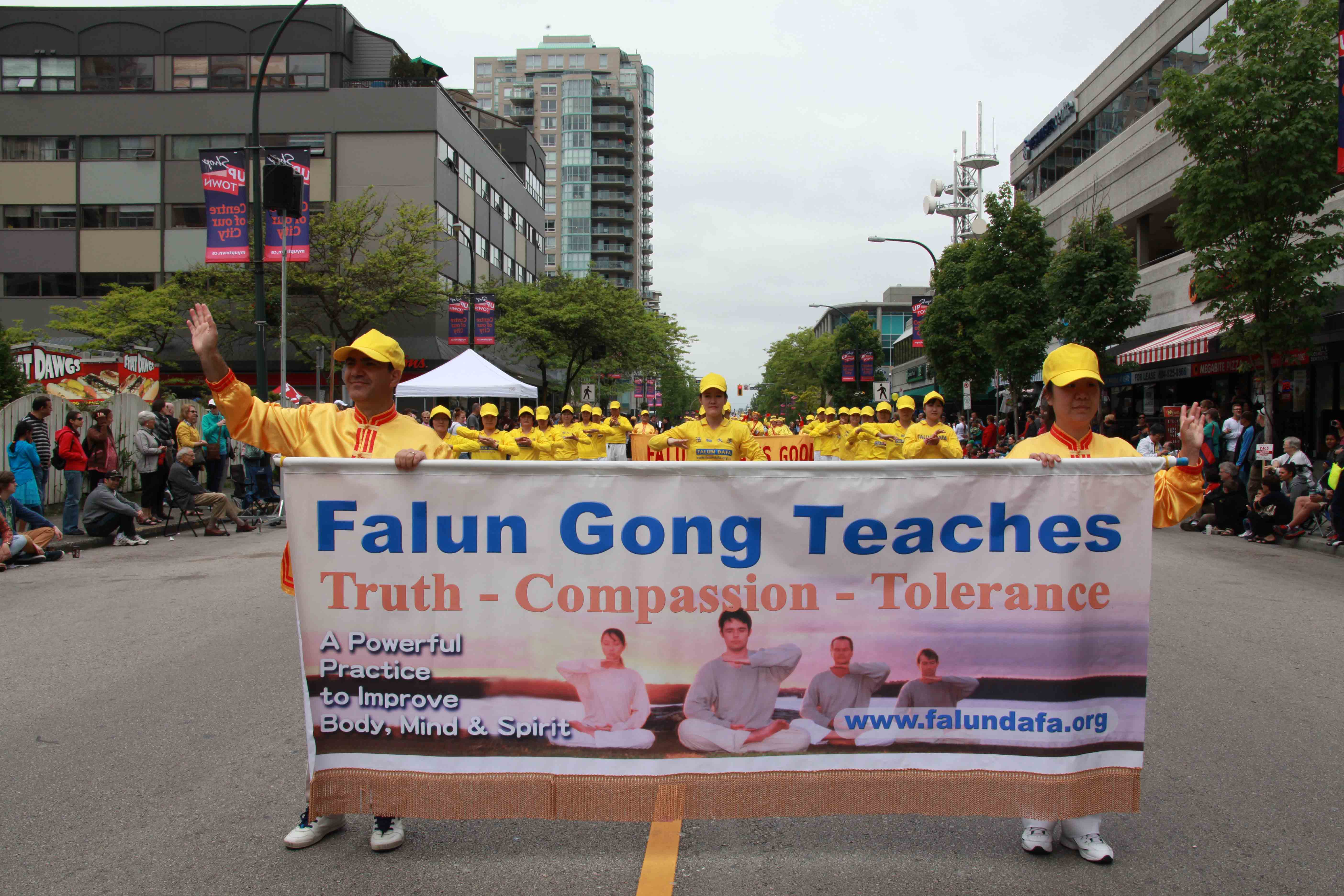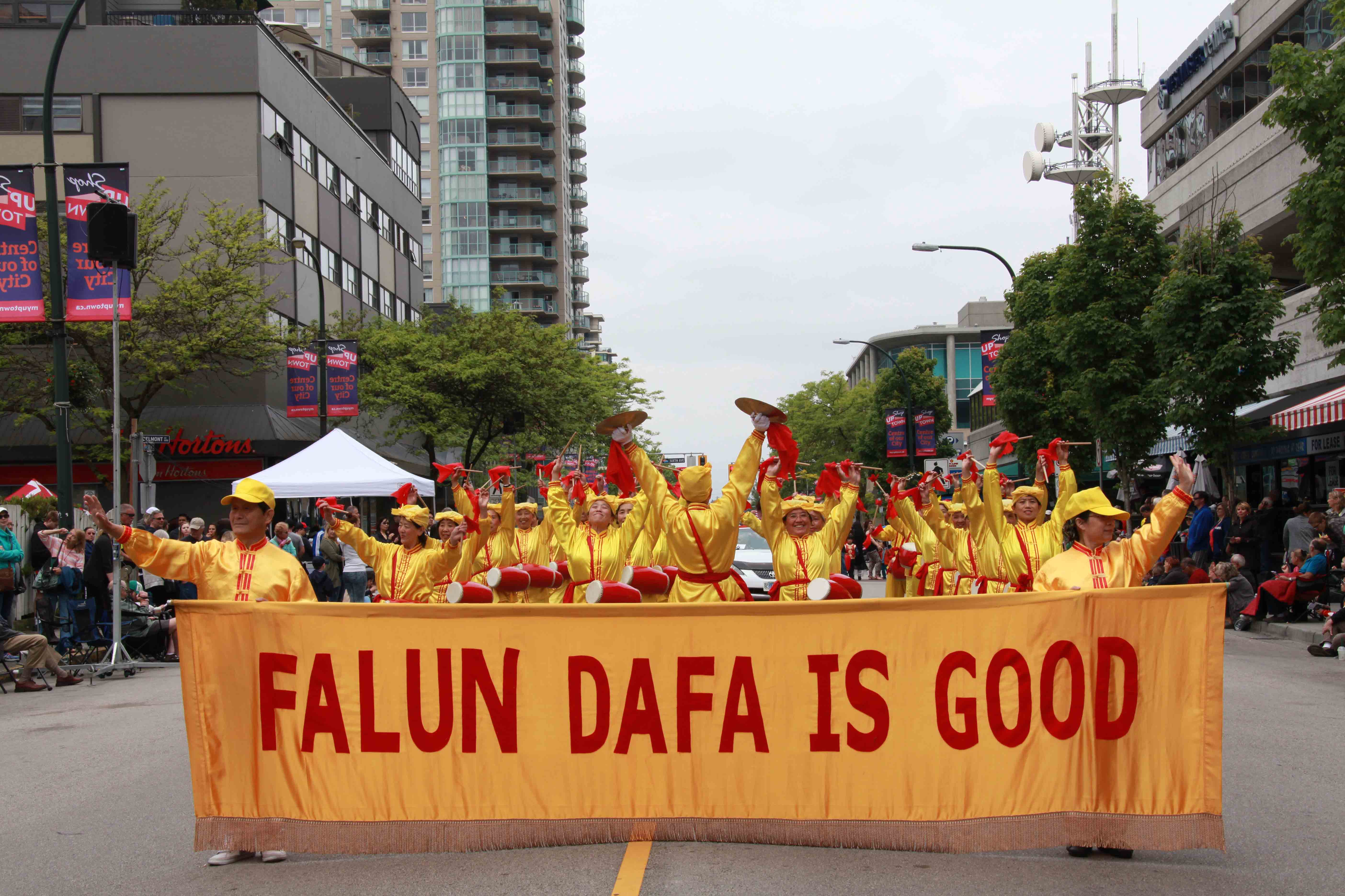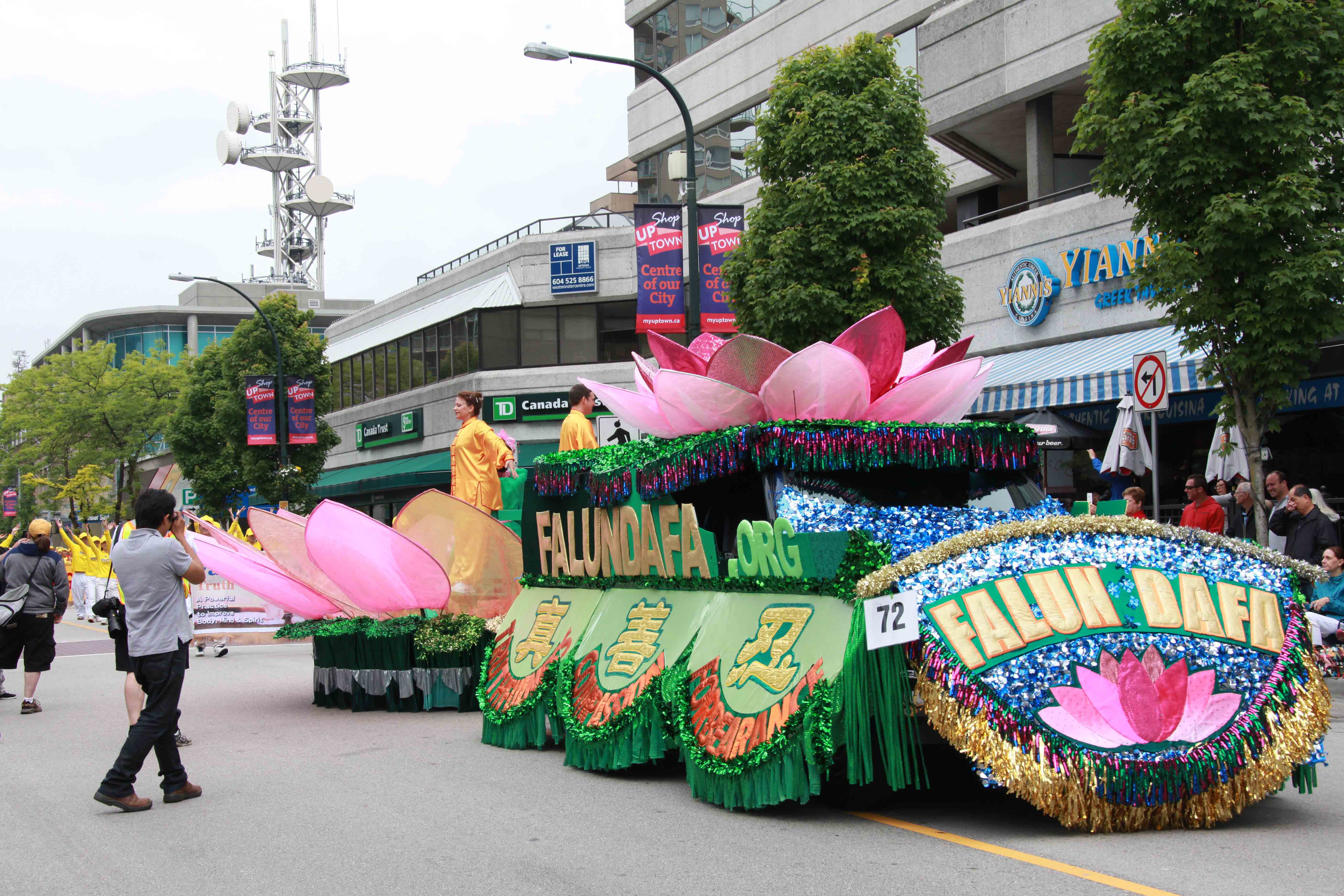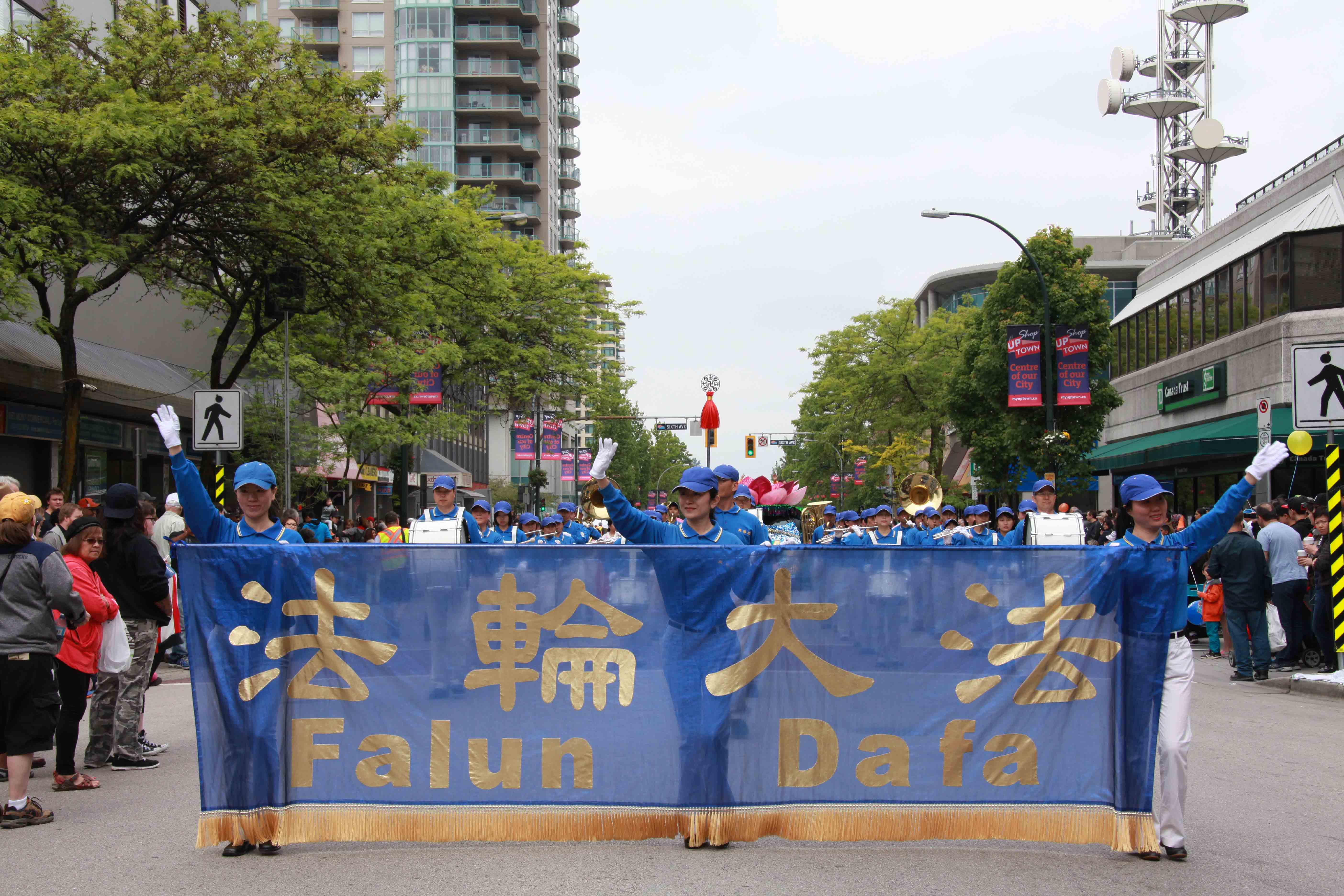 温哥华法轮功学员的游行队伍包括,天国乐团、仙女舞蹈队、法轮功功法演示队、腰鼓队和“真善忍”花车,一路走来受到市民热烈欢迎。