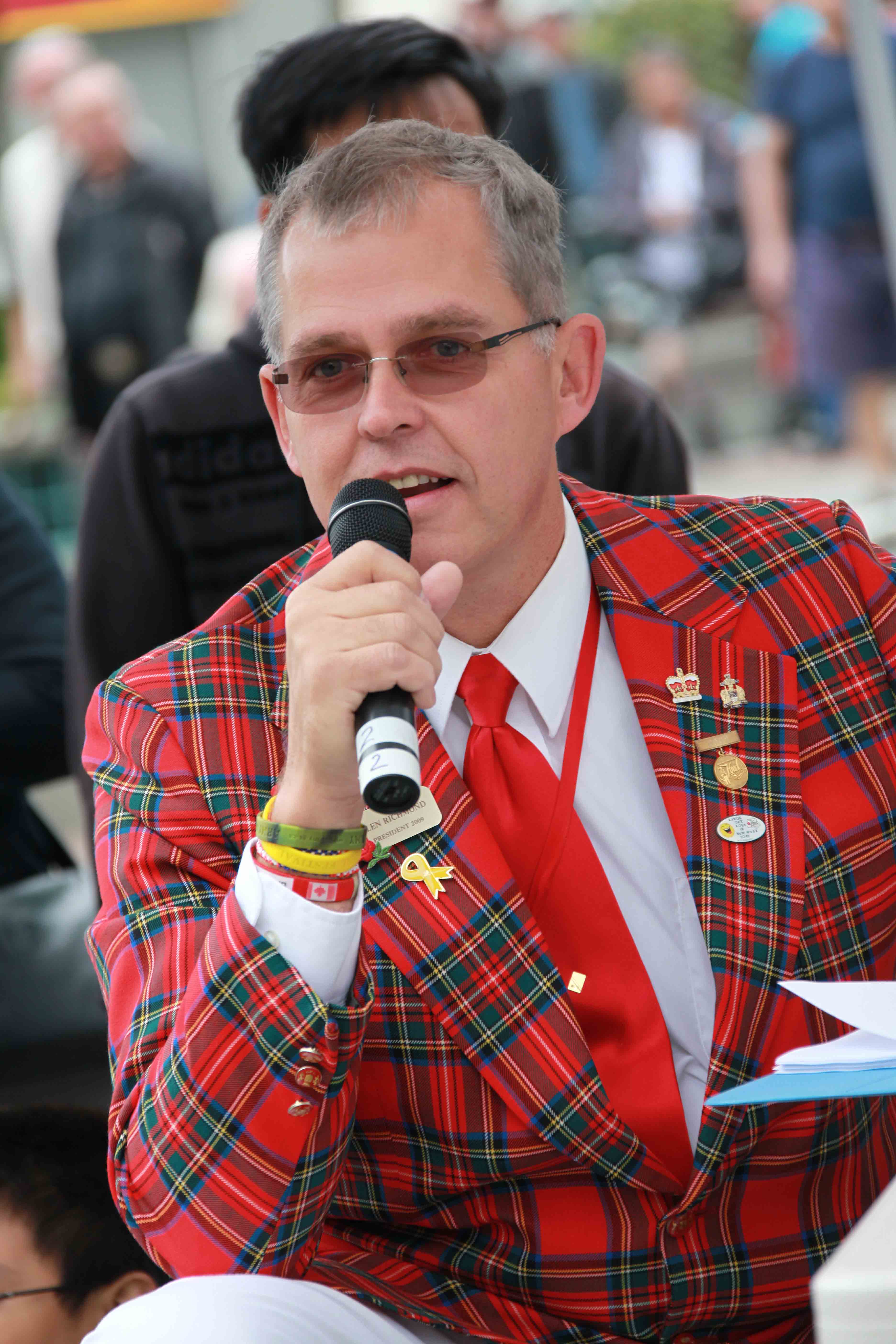 Glen Richmond先生是游行主持人,在法轮功学员游行队伍走过主席台时,他介绍说,法轮功源于中国古老文化,秉持“真善忍”的原则修炼,有五套功法,可以使修炼者身心受益,已经弘传世界一百多个国家,法轮功学员的队伍很祥和有活力,花车也很美。