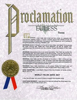 因此,我,琳达·马丁(Linda Martin),尤利斯市(City of Euless)市长,宣布二零一五年五月九日为本市“法轮大法日”,并鼓励居民支持此活动。