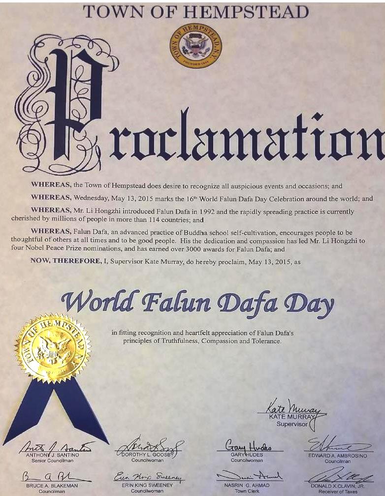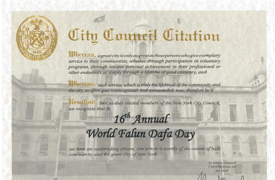 <英文版: http://en.minghui.org/html/articles/2015/6/5/150923.html>纽约市议员及多位区长郡长褒奖法轮大法