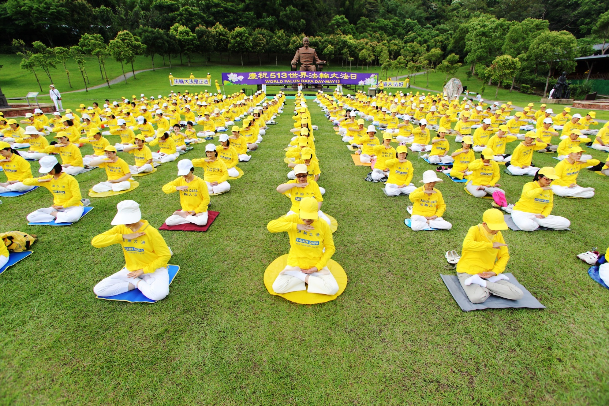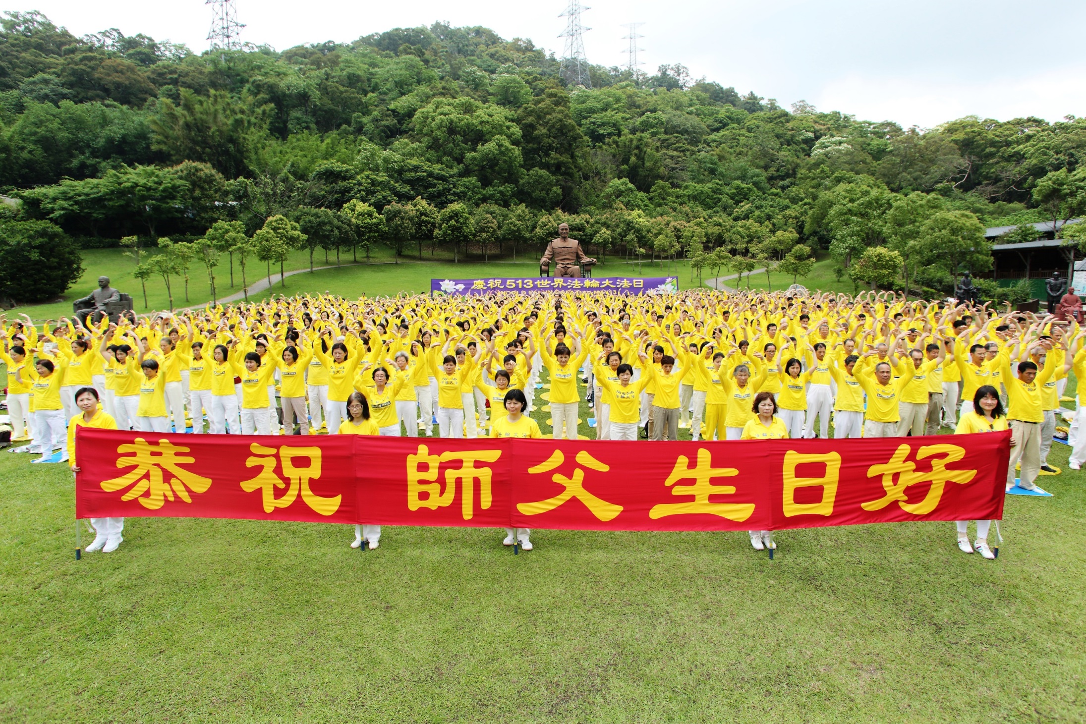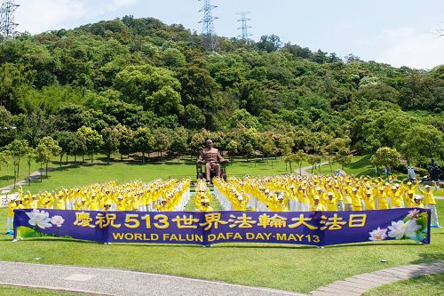 图1:桃竹苗提前欢庆五一三世界法轮大法日,法轮功学员在慈湖集体炼功。