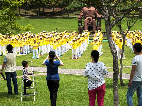 桃竹苗法轮功学员提前于五月三日在慈湖以集体炼功的祥和方式,向来往的台湾及大陆旅客展示法轮功的美好,许多大陆游客拿起相机拍摄下这殊胜的画面。