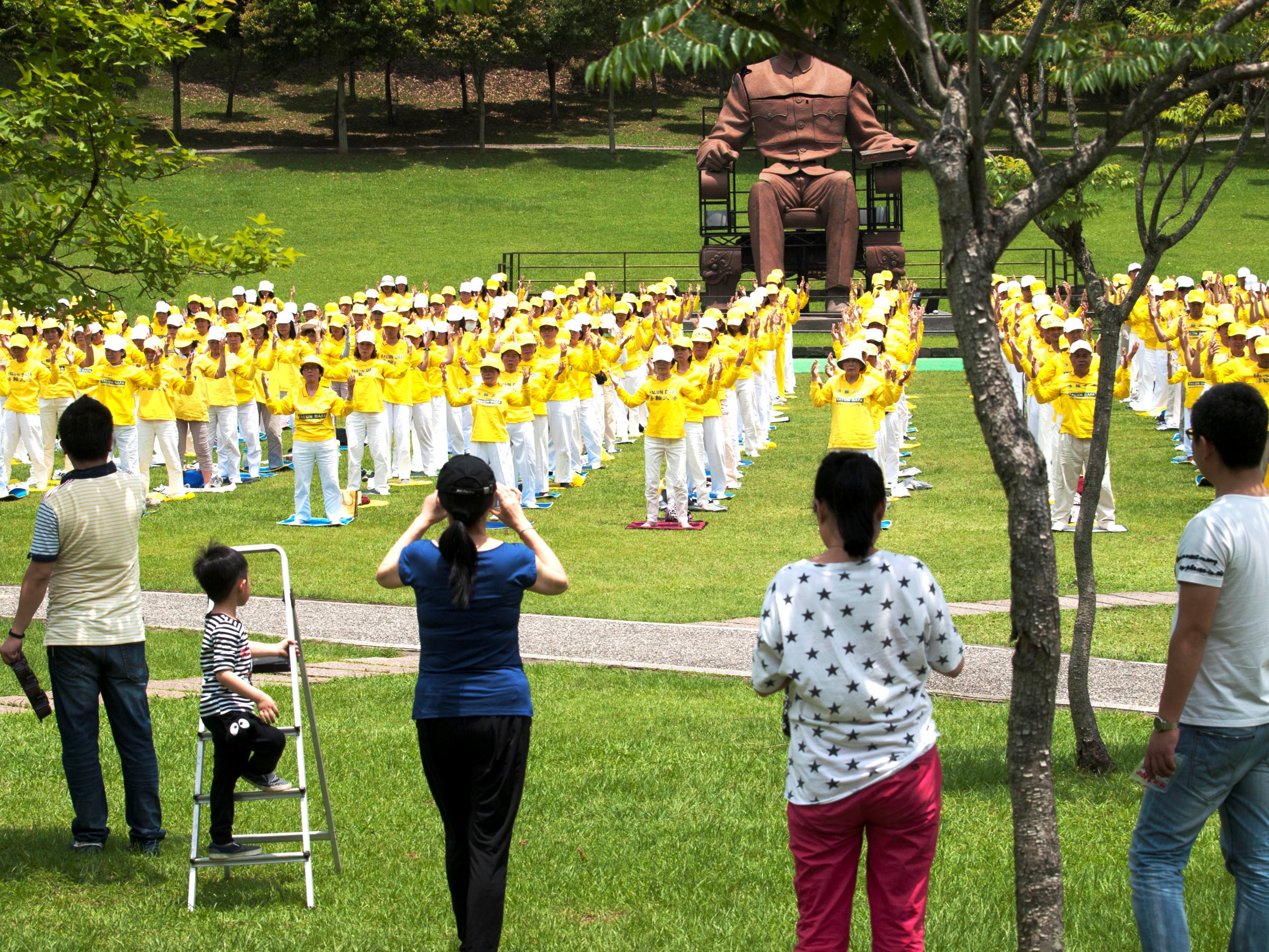 图4-5:遊客们纷纷在法轮功学员集体炼功的场面前拍照留影。