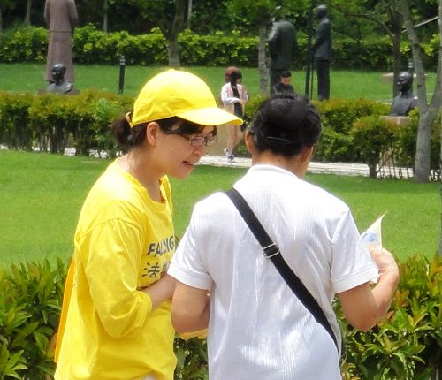 也有来自高雄的遊客表示,非常能理解法轮功学员在景点向大陆游客讲真相,因为他知道,目前在大陆看不到法轮功学员集体炼功的场面。还有来自巴拉圭洽商的外国旅客,在台湾友人的陪同下,了解法轮功洪传及遭受中共迫害的真相。
