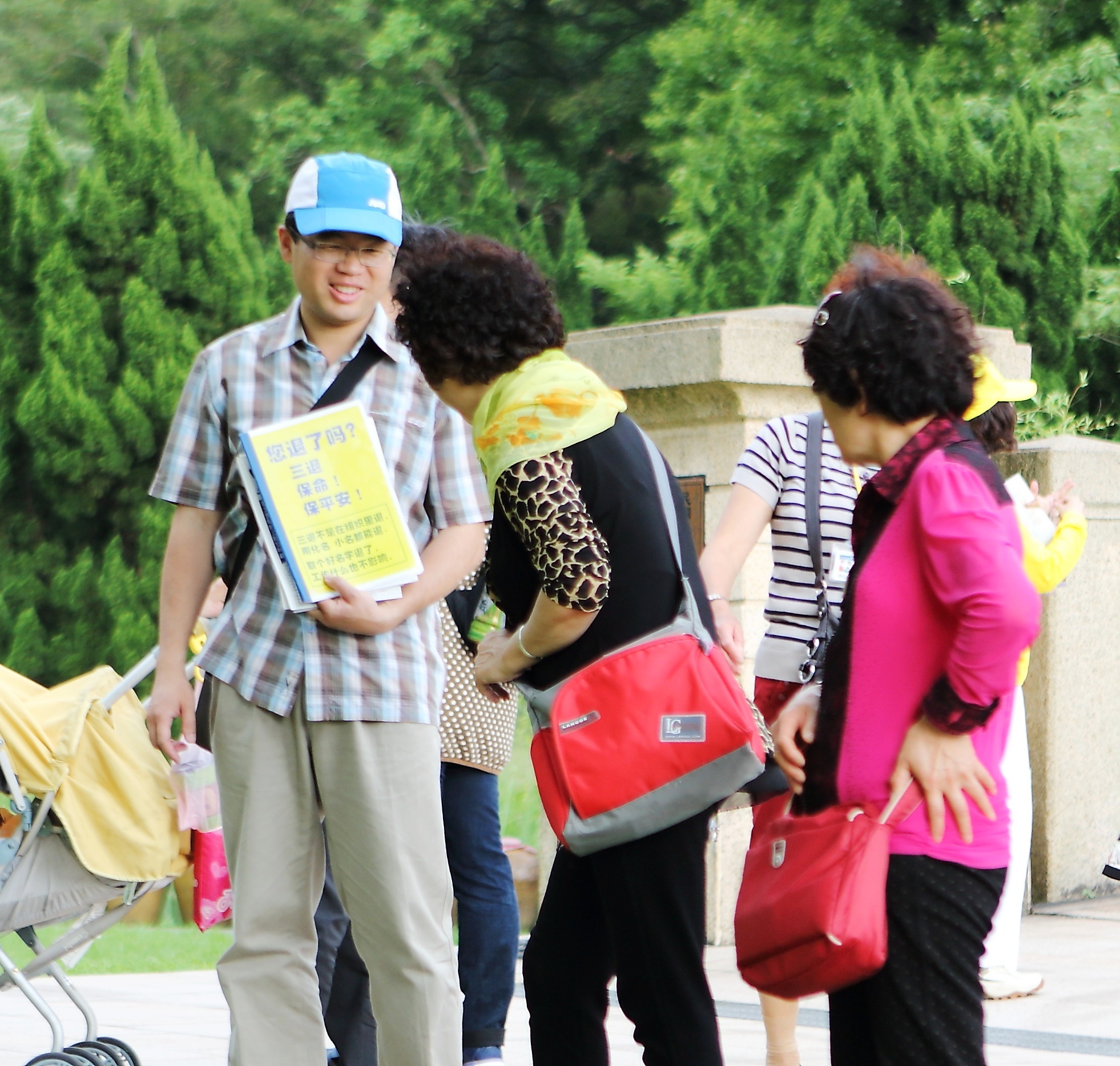图6-7:法轮功学员向大陆游客讲真相。