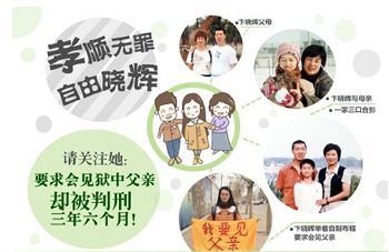 卞晓晖再次恳求监狱无果的情况下,勇敢地在监狱大门的对面打出横幅——“我要见父亲”,在寒风中表达自己的诉求。随后几天卞晓晖分别去石家庄司法厅和监狱管理局反映情况,可这两个机关找种种理由推诿,整整两天不予受理,不给说法。