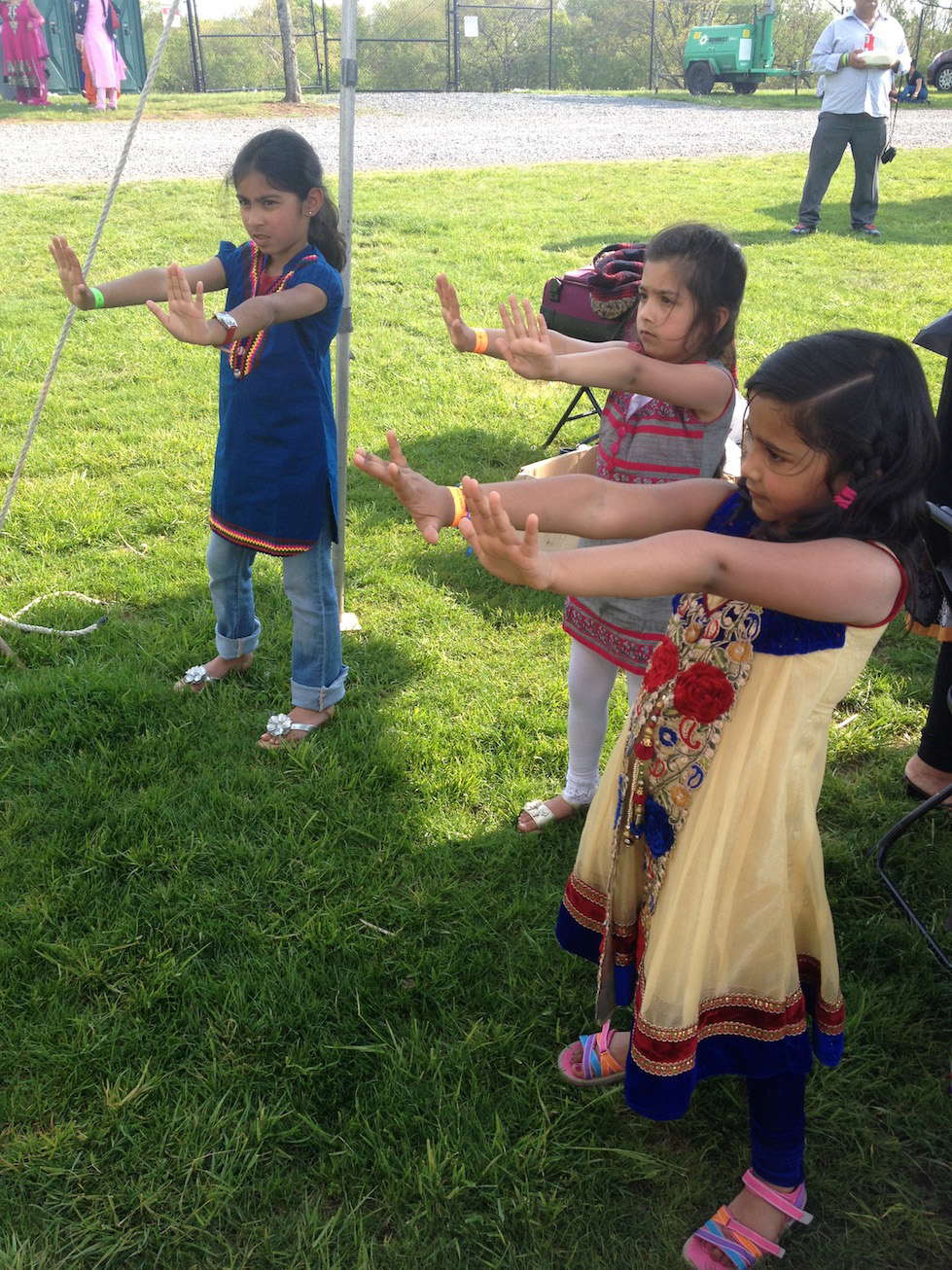 有的印度人接受传单后在现场跟学员学习功法动作。三位天真的小朋友在认真观看功法演示时,主动跟着学员学习功法动作。