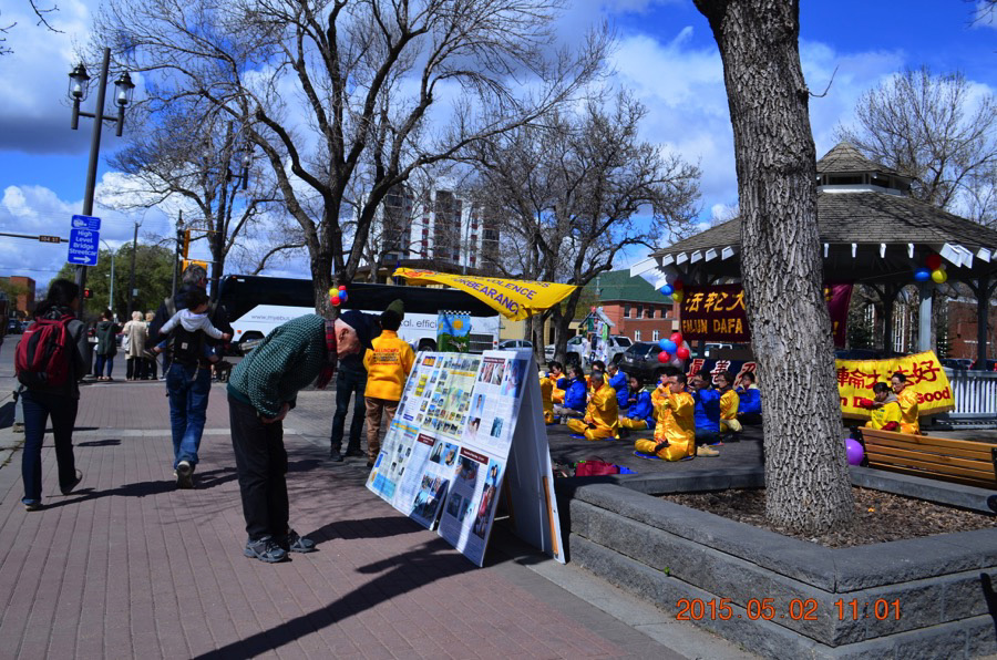 学员们向过往的行人展示法轮大法的五套功法——宁静、祥和的动作与优美、纯净的音乐吸引很多行人驻足观看和拍照。已经知道真相的人们关心的询问今天是什么日子,大家这么高兴。不知道法轮功的人们则主动上前询问情况,当了解到正在中国发生的迫害和活摘器官的罪恶时,表示无法相信如此美好的功法会被禁止、修炼这样功法的人会遭受迫害,他们纷纷在呼吁信上签名,希望加拿大政府能够出面帮助制止迫害。