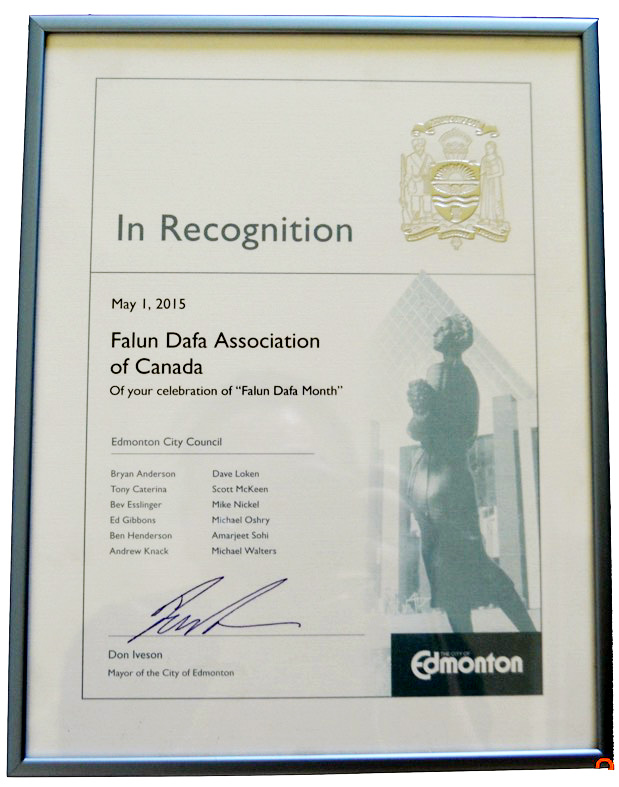 ![]() 埃德蒙顿市长和市议员向加拿大法轮大法协会颁发了“法轮大法月”的褒奖 |