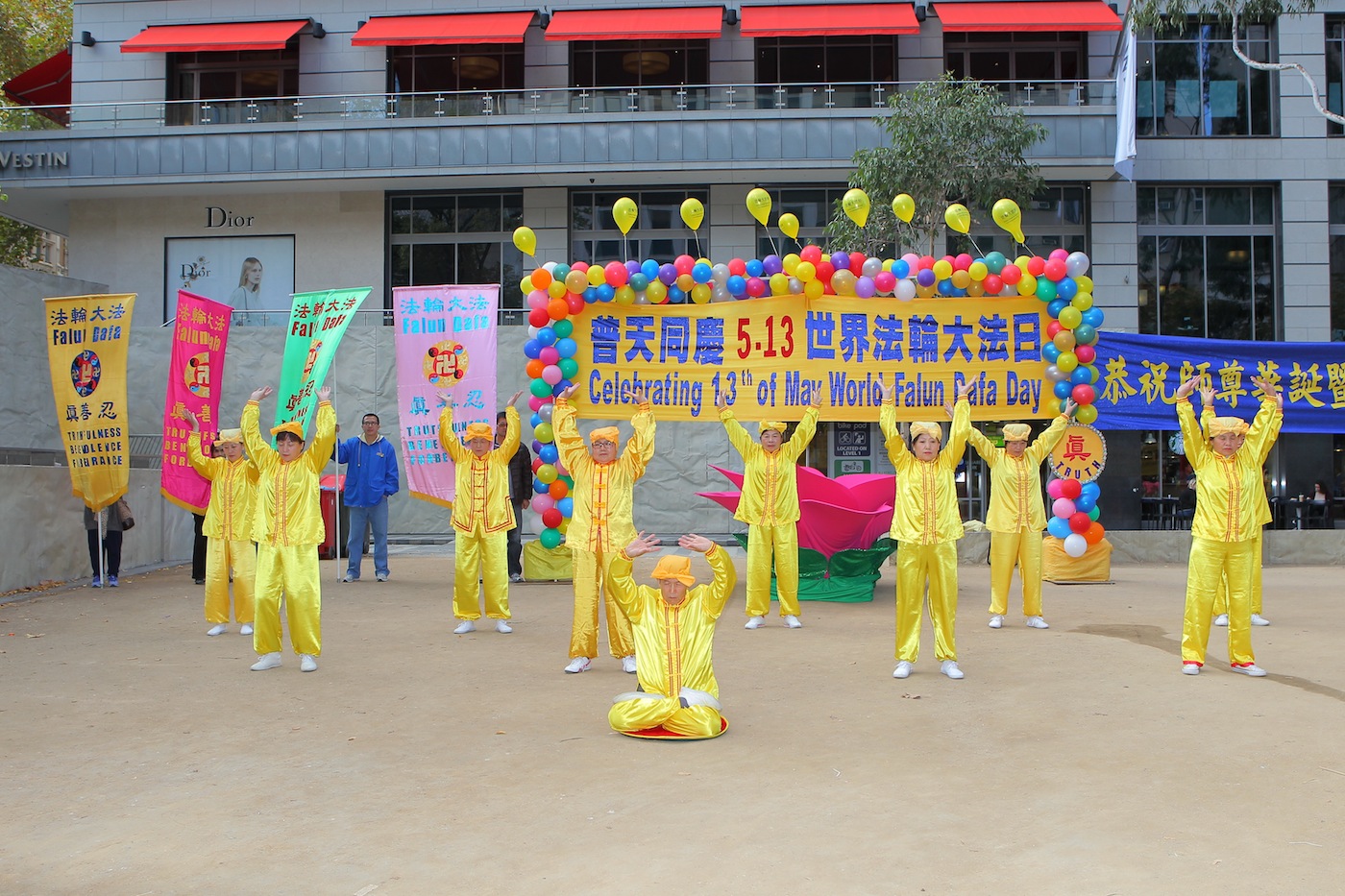 天公作美,明丽的阳光让深秋的墨尔本又回到了夏末般的凉爽宜人。色彩缤纷的气球、醒目的横幅令位于墨尔本市中心的城市广场沉浸在节日欢快的气氛中。从威武雄壮的天国乐团的演奏,到稚嫩清甜的明慧学校法轮功小弟子的合唱,从曼妙的少女彩带双人舞到振奋人心的传统腰鼓表演,还有优美祥和的法轮功五套功法演炼,墨尔本中西各族裔法轮功学员向世人展示了法轮大法的美好。