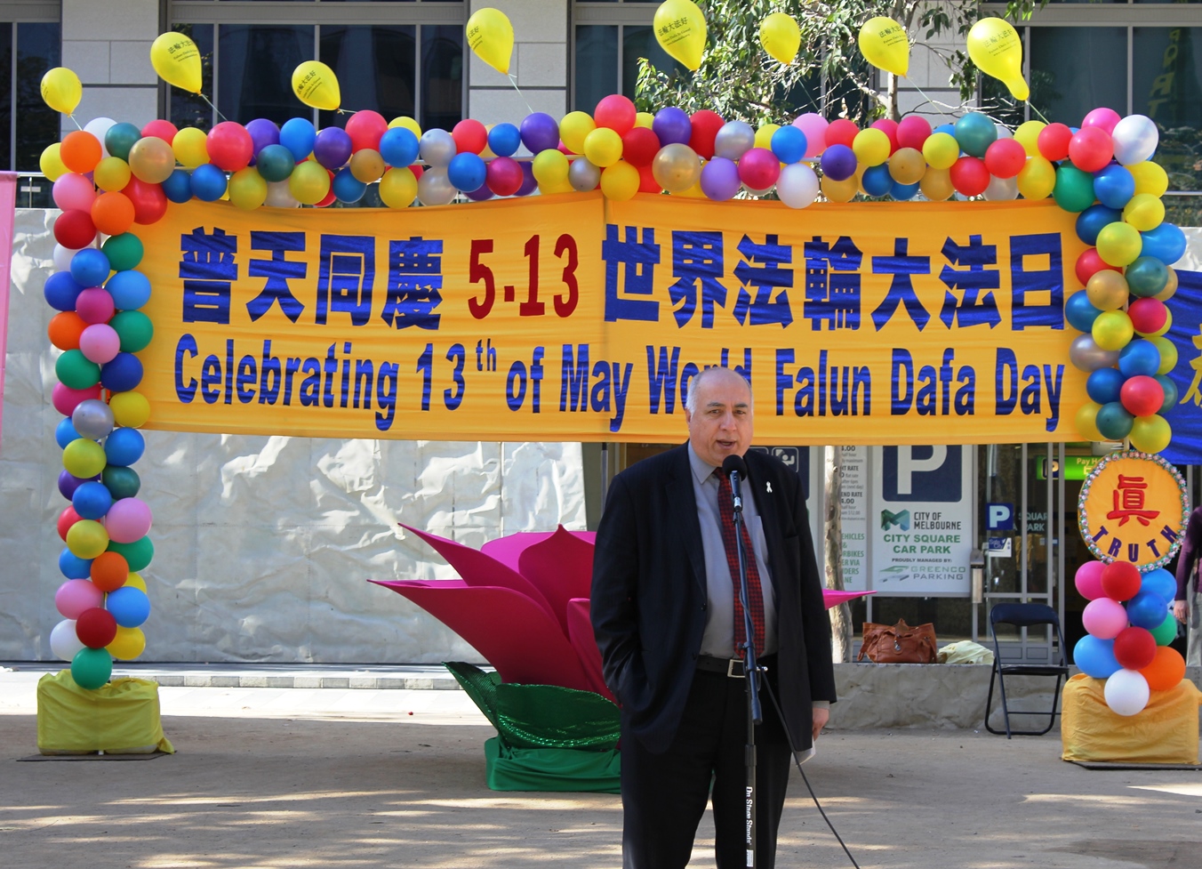 澳民主工党(Democratic Labor Party)维省副主席、联邦财务秘书福拉德(Gerard Flood)先生表示:“今天在这里,墨尔本高兴的庆祝世界法轮大法日,我也来庆祝,是因为法轮大法的修炼原则‘真善忍’是你们带给澳洲、带给全世界的一个伟大的礼物、是无价之宝。你们的美德为我们的公民社会和政治生活做出了伟大的贡献。祥和的功法带给人健康的身心,‘真善忍’的普世价值帮助我们自己和我们的社区发展的更好。”