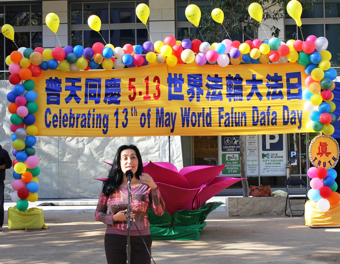 【明慧网二零一五年五月六日】(明慧记者夏纯清墨尔本采访报导)“在小学的时候,身处土耳其偏僻的乡村,家里买不起书的我,却有幸通过当地银行举办的课业比赛获得的奖品──一本介绍中国传统文化的书,了解了什么是佛道神和善恶有报;直到2001年,我随澳洲的丈夫移民墨尔本、找到了法轮功也叫法轮大法,这一深深植根于中国传统修炼文化的高德大法,惊叹于冥冥之中的缘分,我的人生也因为修炼‘真善忍’发生了神奇的变化。我变好了,不再为名利争斗,我身上各种长期形成的病痛消失了。”这是略带口音、但声音悦耳的土耳其裔英语教师高德瑞(Cansin Goldring),在二零一五年五月三日星期日下午墨尔本举办的“世界法轮大法日”的隆重庆典上,分享十四年来修炼法轮功的体会,生动的故事深深吸引了过往的民众。