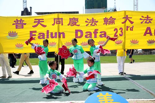 法轮功学员在加拿大国会山前举行庆典,庆祝法轮大法弘传世界二十三周年。